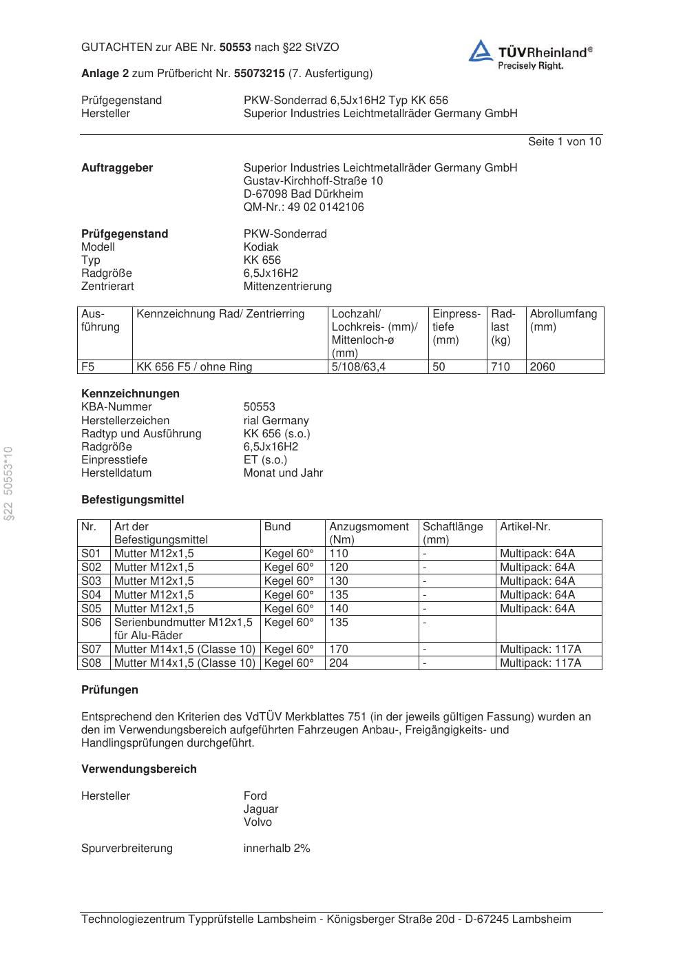 Dieses Gutachten (abe) bezieht sich auf die Alufelge brand-rial KK 656 in der Ausführung 6.5Jx16 ET 0, Mittenloch 0 mm (KBA 50553). Im PDF findest du typischerweise zulässige Reifengrößen, Auflagen/Anbauhinweise und – je nach Dokument – Hinweise zur Eintragung.