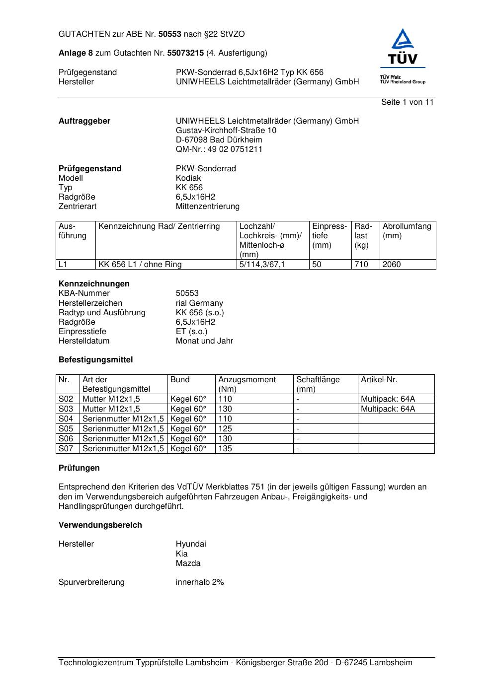 Dieses Gutachten (abe) bezieht sich auf die Alufelge brand-rial KK 656 in der Ausführung 6.5Jx16 ET 0, Mittenloch 0 mm (KBA 50553). Im PDF findest du typischerweise zulässige Reifengrößen, Auflagen/Anbauhinweise und – je nach Dokument – Hinweise zur Eintragung.