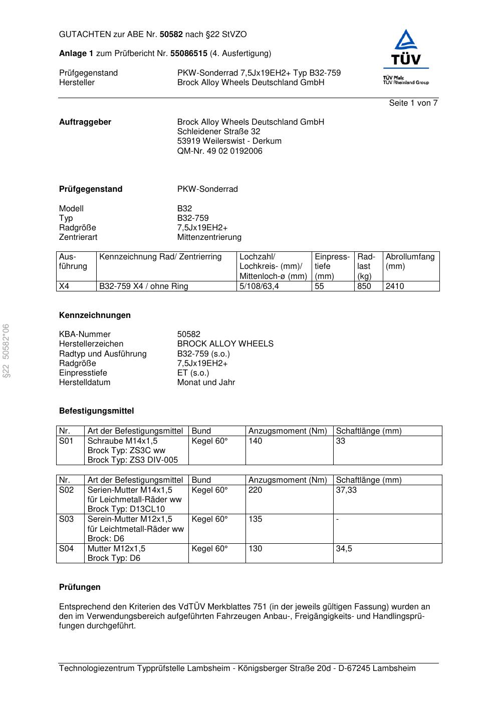 Dieses Gutachten (abe) bezieht sich auf die Alufelge Brock B32-75 9 in der Ausführung ET 0, Mittenloch 0 mm (KBA 50582). Im PDF findest du typischerweise zulässige Reifengrößen, Auflagen/Anbauhinweise und – je nach Dokument – Hinweise zur Eintragung.