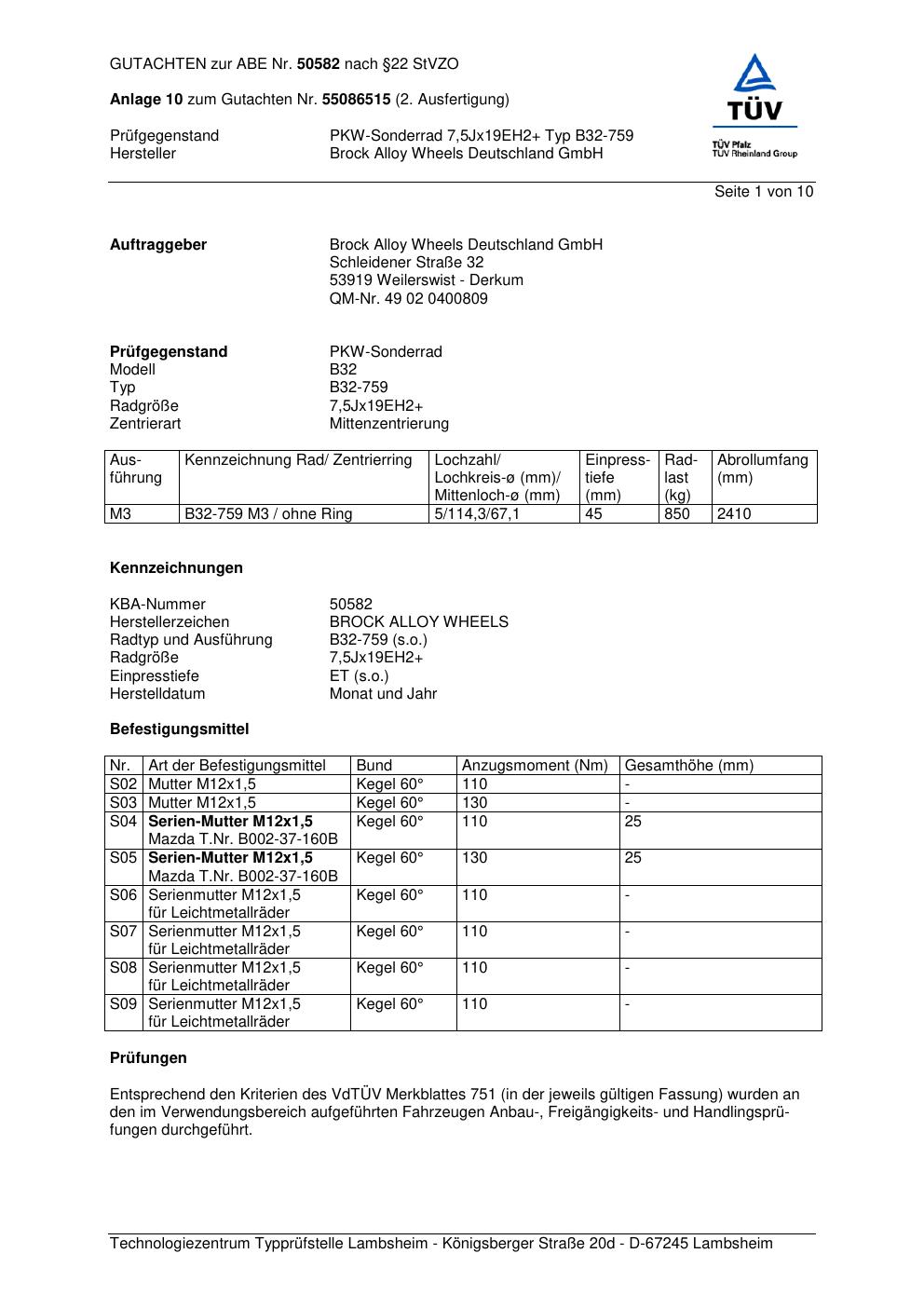 Dieses Gutachten (abe) bezieht sich auf die Alufelge Brock B32-75 9 in der Ausführung 7.5Jx19 ET 0, Mittenloch 0 mm (KBA 50582). Im PDF findest du typischerweise zulässige Reifengrößen, Auflagen/Anbauhinweise und – je nach Dokument – Hinweise zur Eintragung.