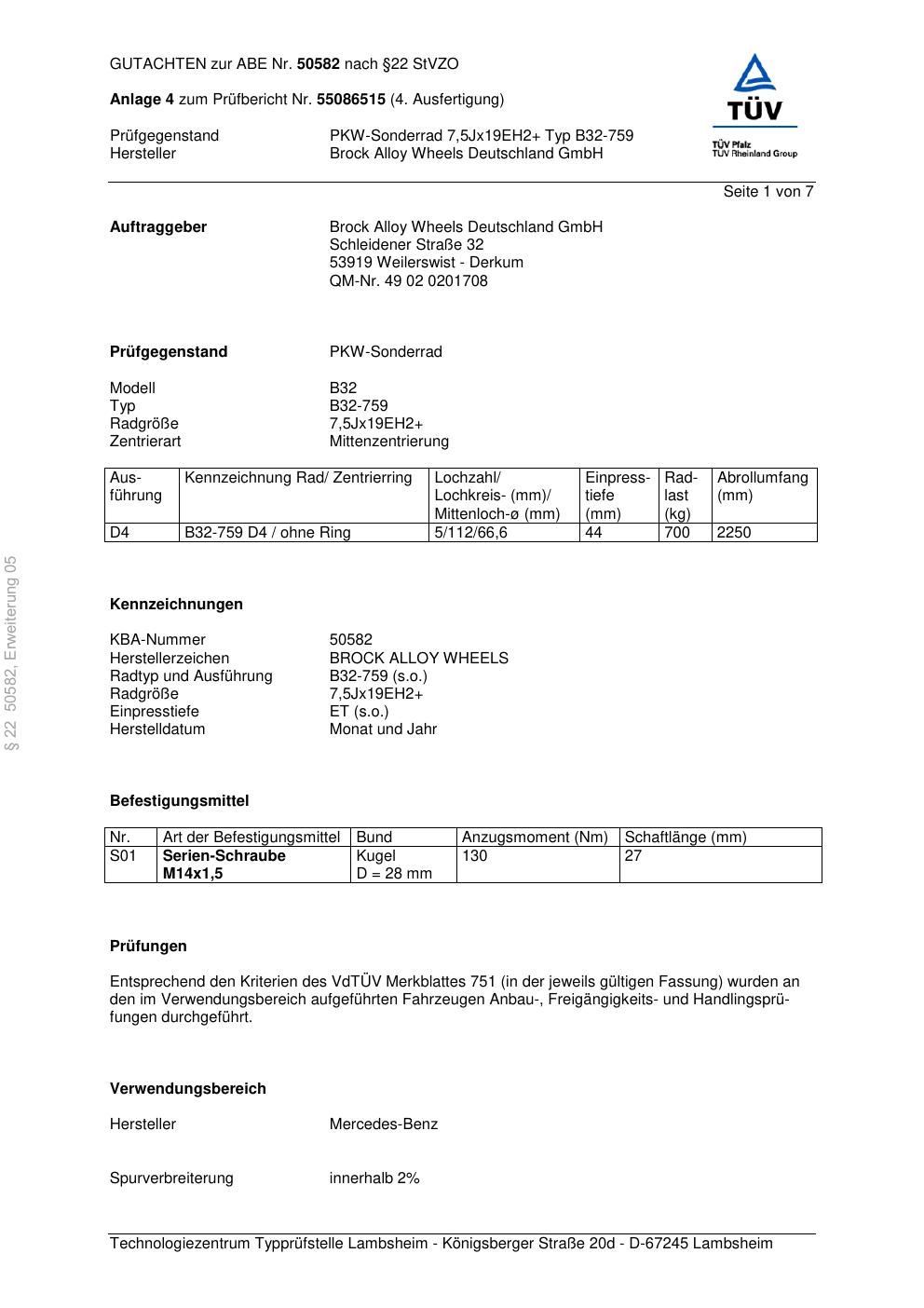 Dieses Gutachten (abe) bezieht sich auf die Alufelge Brock B32-75 9 in der Ausführung ET 0, Mittenloch 0 mm (KBA 50582). Im PDF findest du typischerweise zulässige Reifengrößen, Auflagen/Anbauhinweise und – je nach Dokument – Hinweise zur Eintragung.