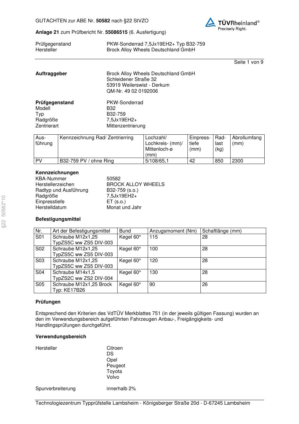 Dieses Gutachten (abe) bezieht sich auf die Alufelge Brock B32-75 9 in der Ausführung ET 0, Mittenloch 0 mm (KBA 50582). Im PDF findest du typischerweise zulässige Reifengrößen, Auflagen/Anbauhinweise und – je nach Dokument – Hinweise zur Eintragung.