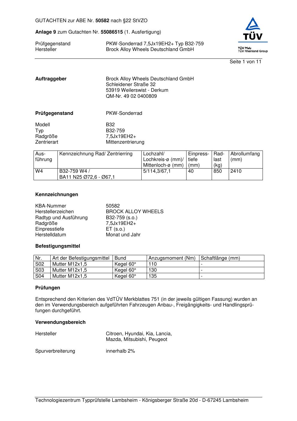 Dieses Gutachten (abe) bezieht sich auf die Alufelge Brock B32-75 9 in der Ausführung ET 0, Mittenloch 0 mm (KBA 50582). Im PDF findest du typischerweise zulässige Reifengrößen, Auflagen/Anbauhinweise und – je nach Dokument – Hinweise zur Eintragung.