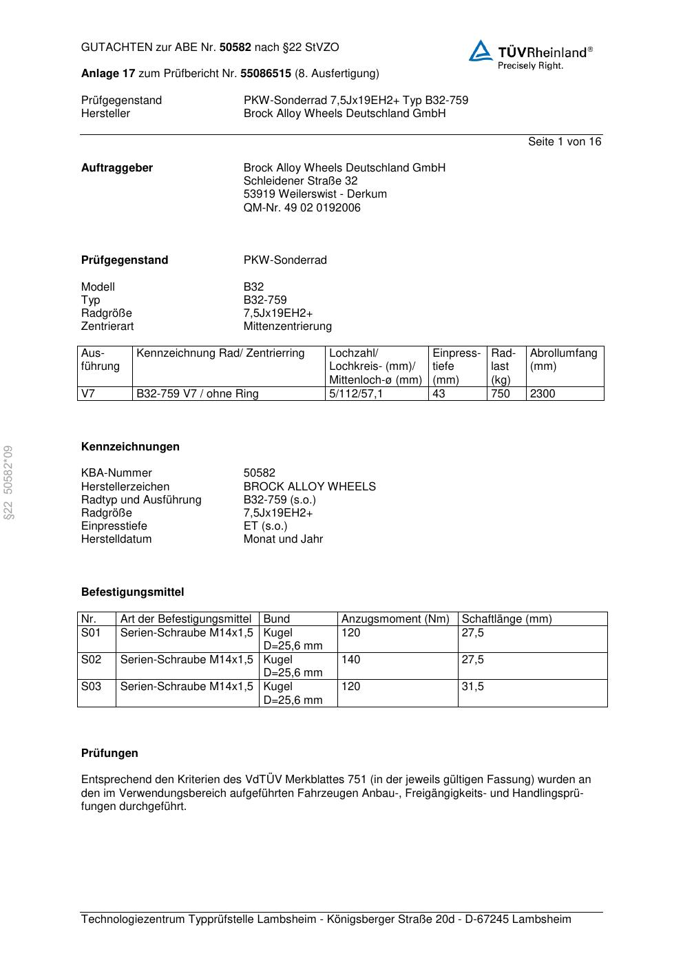 Dieses Gutachten (abe) bezieht sich auf die Alufelge Brock B32-75 9 in der Ausführung 8.5Jx19 ET 0, Mittenloch 0 mm (KBA 50582). Im PDF findest du typischerweise zulässige Reifengrößen, Auflagen/Anbauhinweise und – je nach Dokument – Hinweise zur Eintragung.