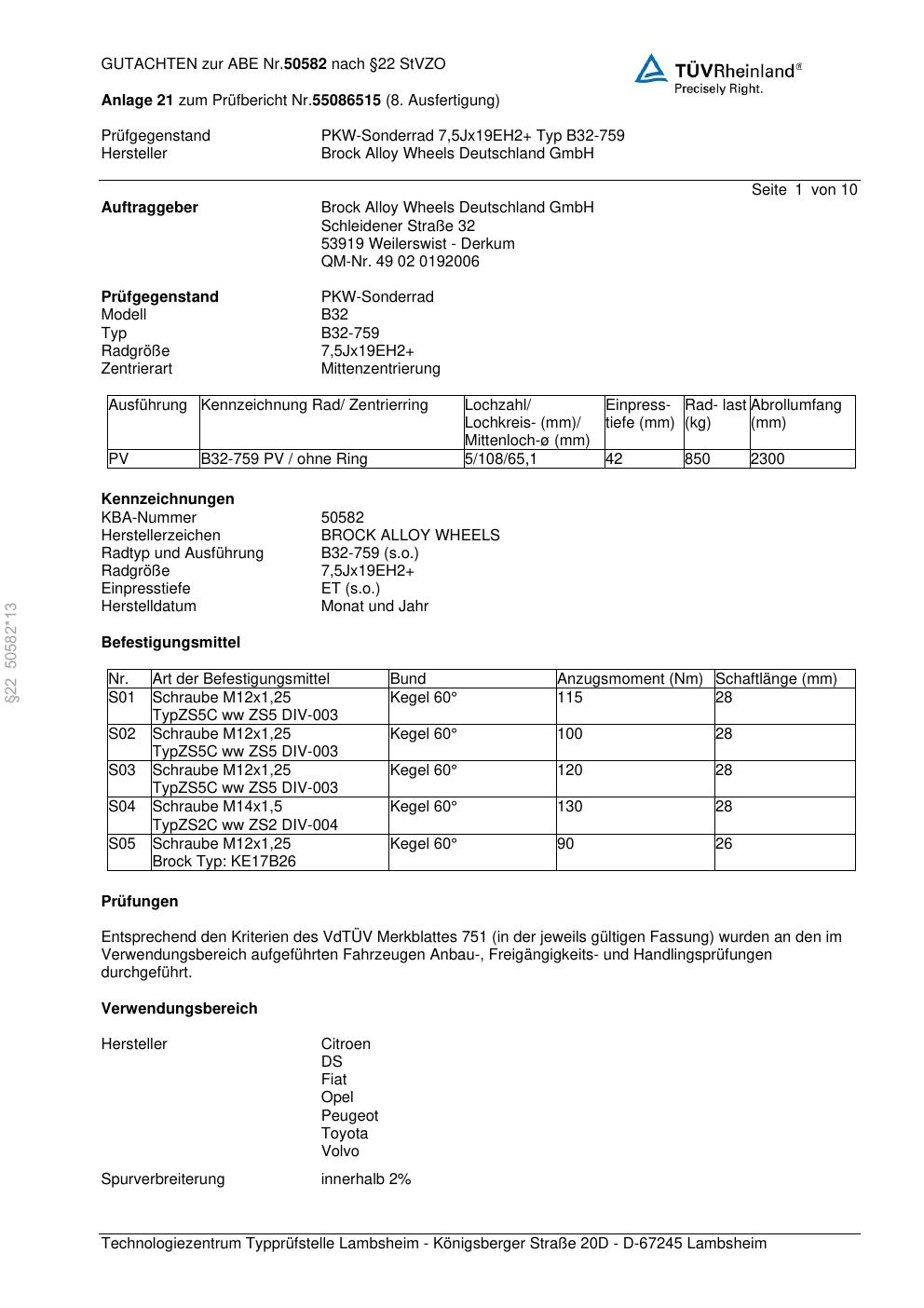 Dieses Gutachten (abe) bezieht sich auf die Alufelge Brock B32-75 9 in der Ausführung ET 0, Mittenloch 0 mm (KBA 50582). Im PDF findest du typischerweise zulässige Reifengrößen, Auflagen/Anbauhinweise und – je nach Dokument – Hinweise zur Eintragung.