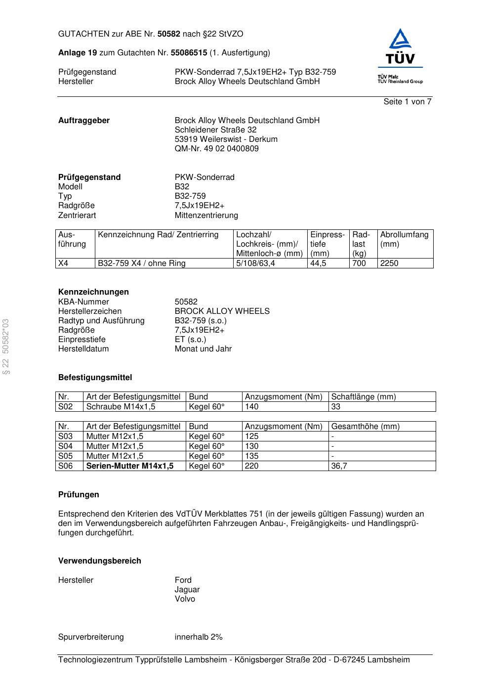 Dieses Gutachten (abe) bezieht sich auf die Alufelge Brock B32-75 9 in der Ausführung ET 0, Mittenloch 0 mm (KBA 50582). Im PDF findest du typischerweise zulässige Reifengrößen, Auflagen/Anbauhinweise und – je nach Dokument – Hinweise zur Eintragung.