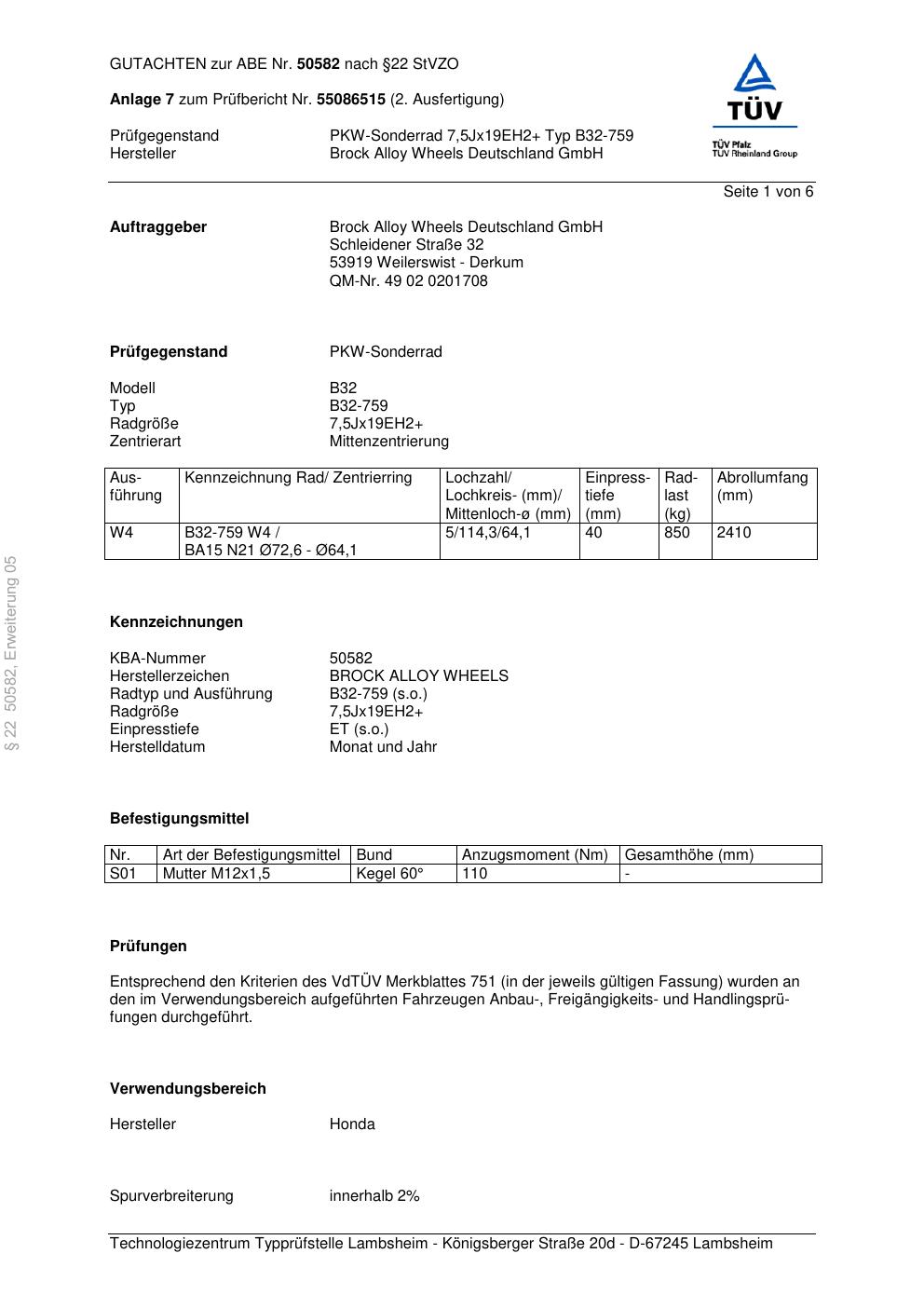Dieses Gutachten (abe) bezieht sich auf die Alufelge Brock B32-75 9 in der Ausführung ET 0, Mittenloch 0 mm (KBA 50582). Im PDF findest du typischerweise zulässige Reifengrößen, Auflagen/Anbauhinweise und – je nach Dokument – Hinweise zur Eintragung.