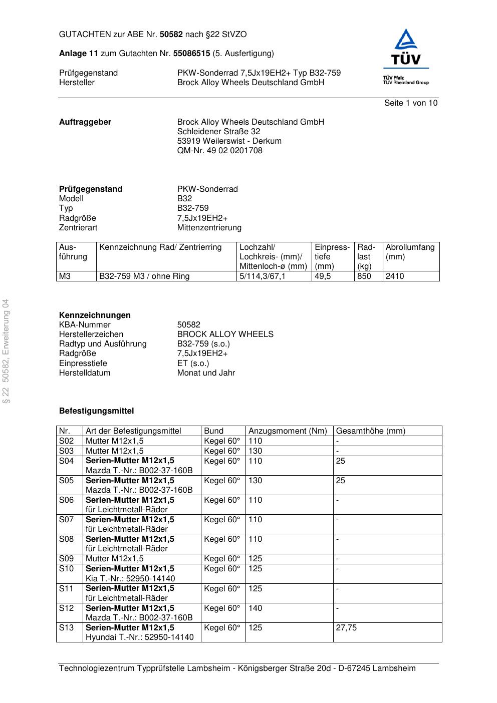 Dieses Gutachten (abe) bezieht sich auf die Alufelge Brock B32-75 9 in der Ausführung ET 0, Mittenloch 0 mm (KBA 50582). Im PDF findest du typischerweise zulässige Reifengrößen, Auflagen/Anbauhinweise und – je nach Dokument – Hinweise zur Eintragung.