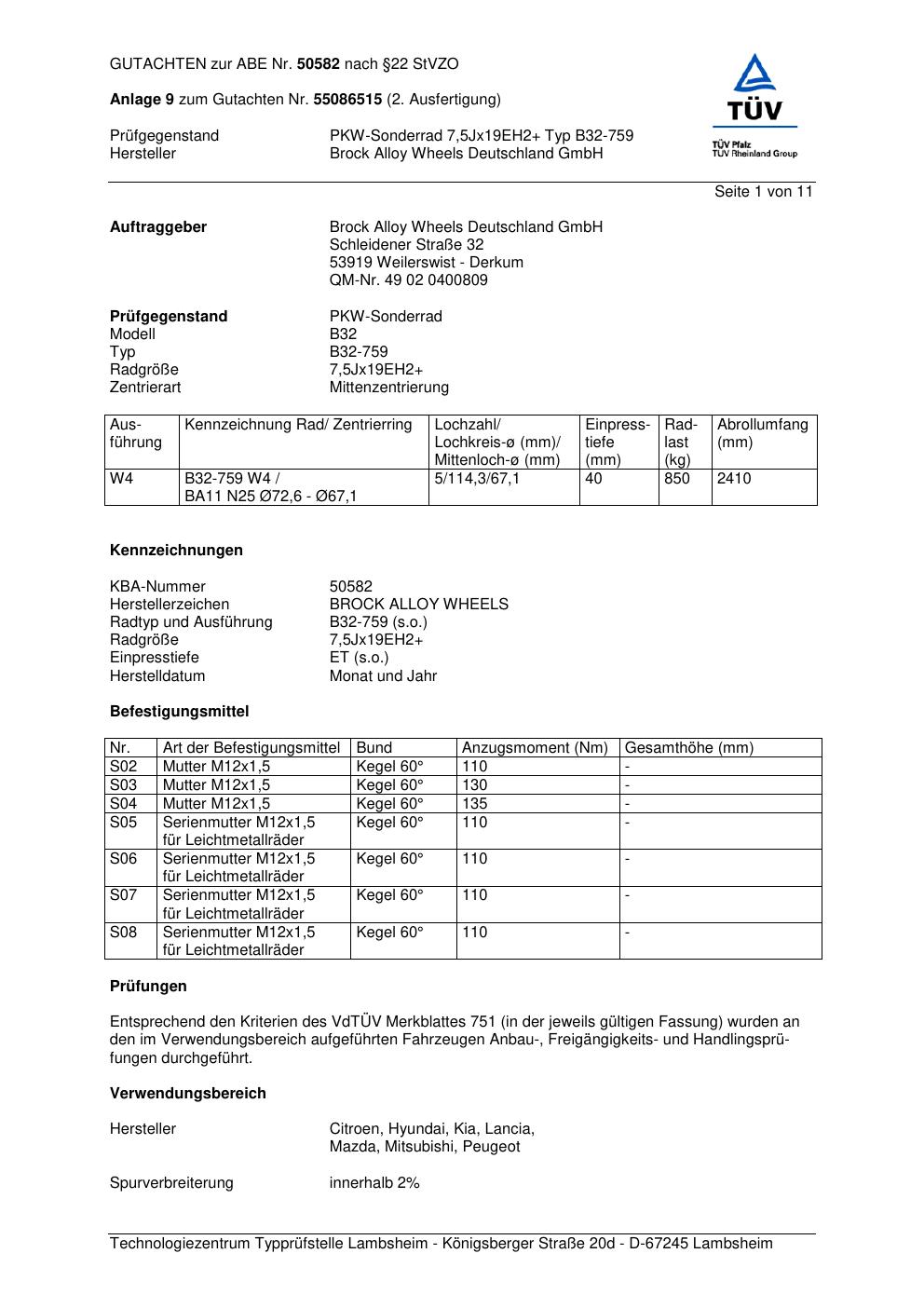 Dieses Gutachten (abe) bezieht sich auf die Alufelge Brock B32-75 9 in der Ausführung 7.5Jx19 ET 0, Mittenloch 0 mm (KBA 50582). Im PDF findest du typischerweise zulässige Reifengrößen, Auflagen/Anbauhinweise und – je nach Dokument – Hinweise zur Eintragung.