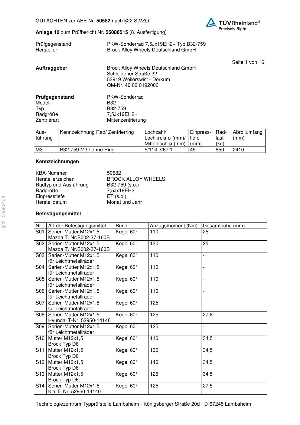 Dieses Gutachten (abe) bezieht sich auf die Alufelge Brock B32-75 9 in der Ausführung ET 0, Mittenloch 0 mm (KBA 50582). Im PDF findest du typischerweise zulässige Reifengrößen, Auflagen/Anbauhinweise und – je nach Dokument – Hinweise zur Eintragung.