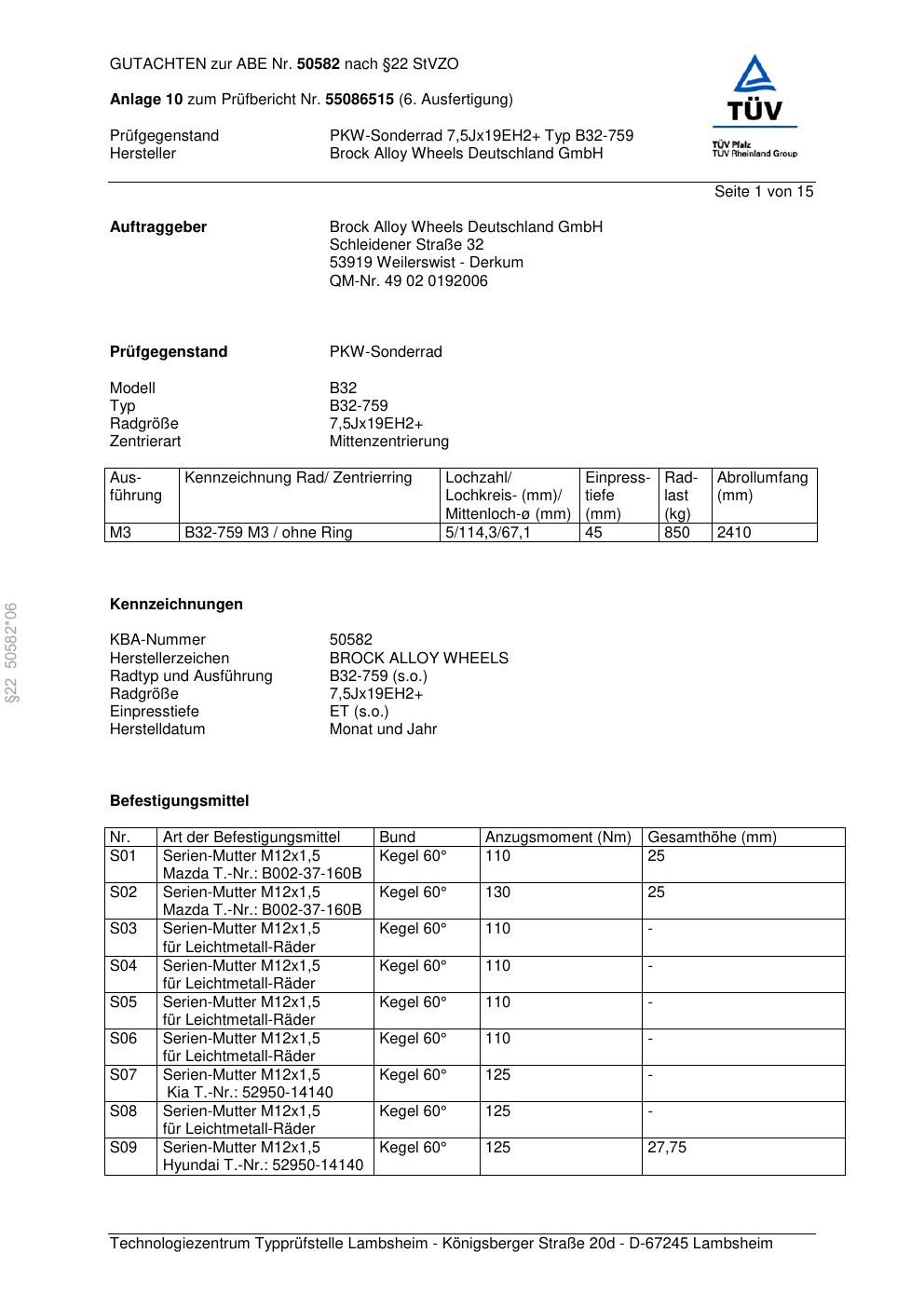 Dieses Gutachten (abe) bezieht sich auf die Alufelge Brock B32-75 9 in der Ausführung ET 0, Mittenloch 0 mm (KBA 50582). Im PDF findest du typischerweise zulässige Reifengrößen, Auflagen/Anbauhinweise und – je nach Dokument – Hinweise zur Eintragung.