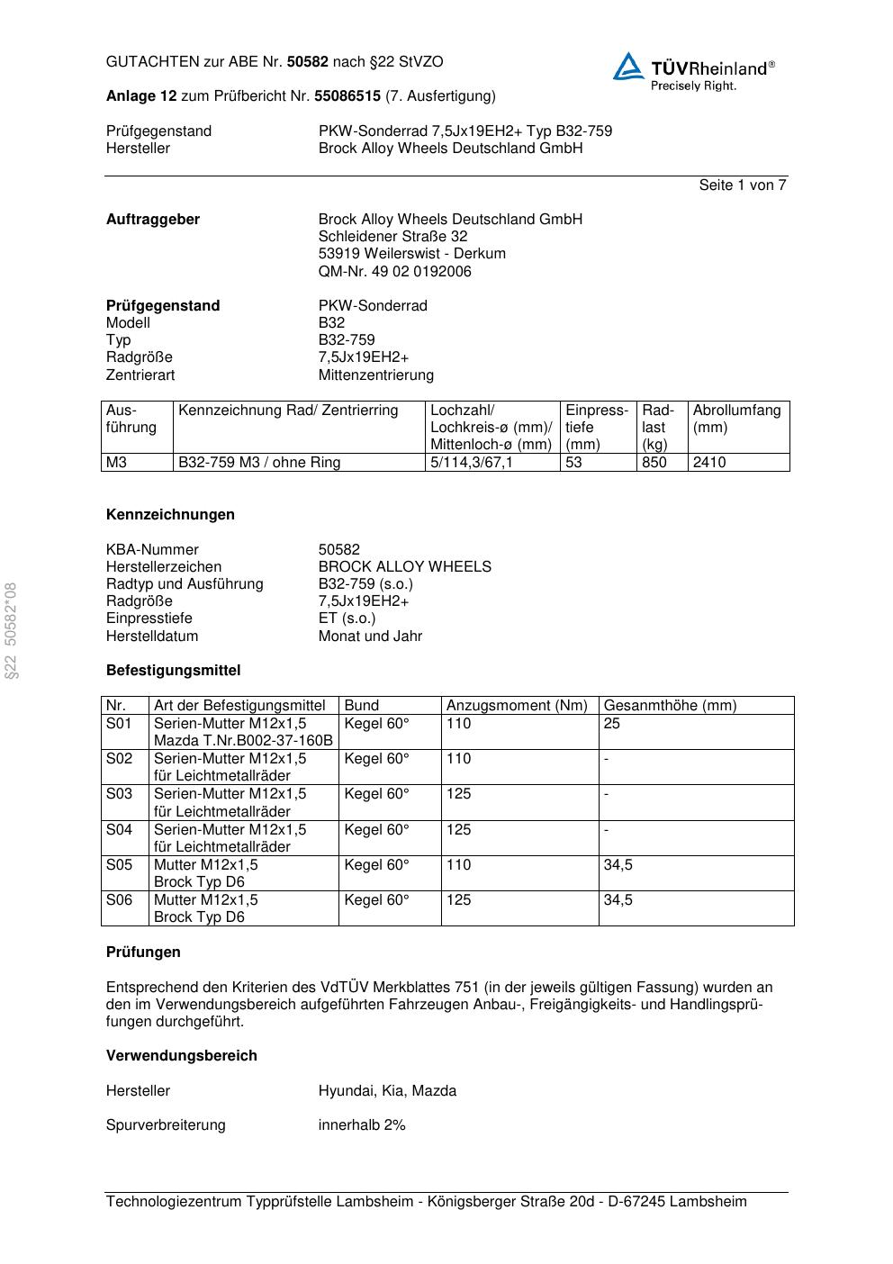 Dieses Gutachten (abe) bezieht sich auf die Alufelge Brock B32-75 9 in der Ausführung ET 0, Mittenloch 0 mm (KBA 50582). Im PDF findest du typischerweise zulässige Reifengrößen, Auflagen/Anbauhinweise und – je nach Dokument – Hinweise zur Eintragung.