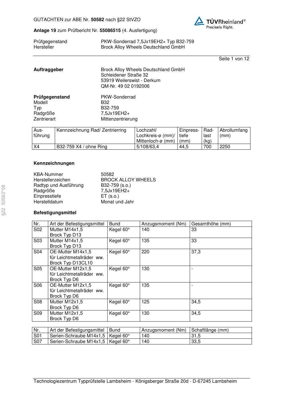 Dieses Gutachten (abe) bezieht sich auf die Alufelge Brock B32-75 9 in der Ausführung 8.5Jx21 ET 0, Mittenloch 0 mm (KBA 50582). Im PDF findest du typischerweise zulässige Reifengrößen, Auflagen/Anbauhinweise und – je nach Dokument – Hinweise zur Eintragung.