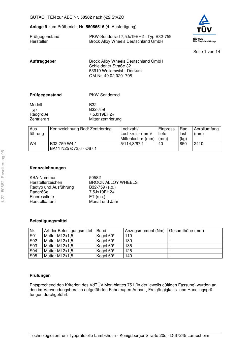 Dieses Gutachten (abe) bezieht sich auf die Alufelge Brock B32-75 9 in der Ausführung ET 0, Mittenloch 0 mm (KBA 50582). Im PDF findest du typischerweise zulässige Reifengrößen, Auflagen/Anbauhinweise und – je nach Dokument – Hinweise zur Eintragung.