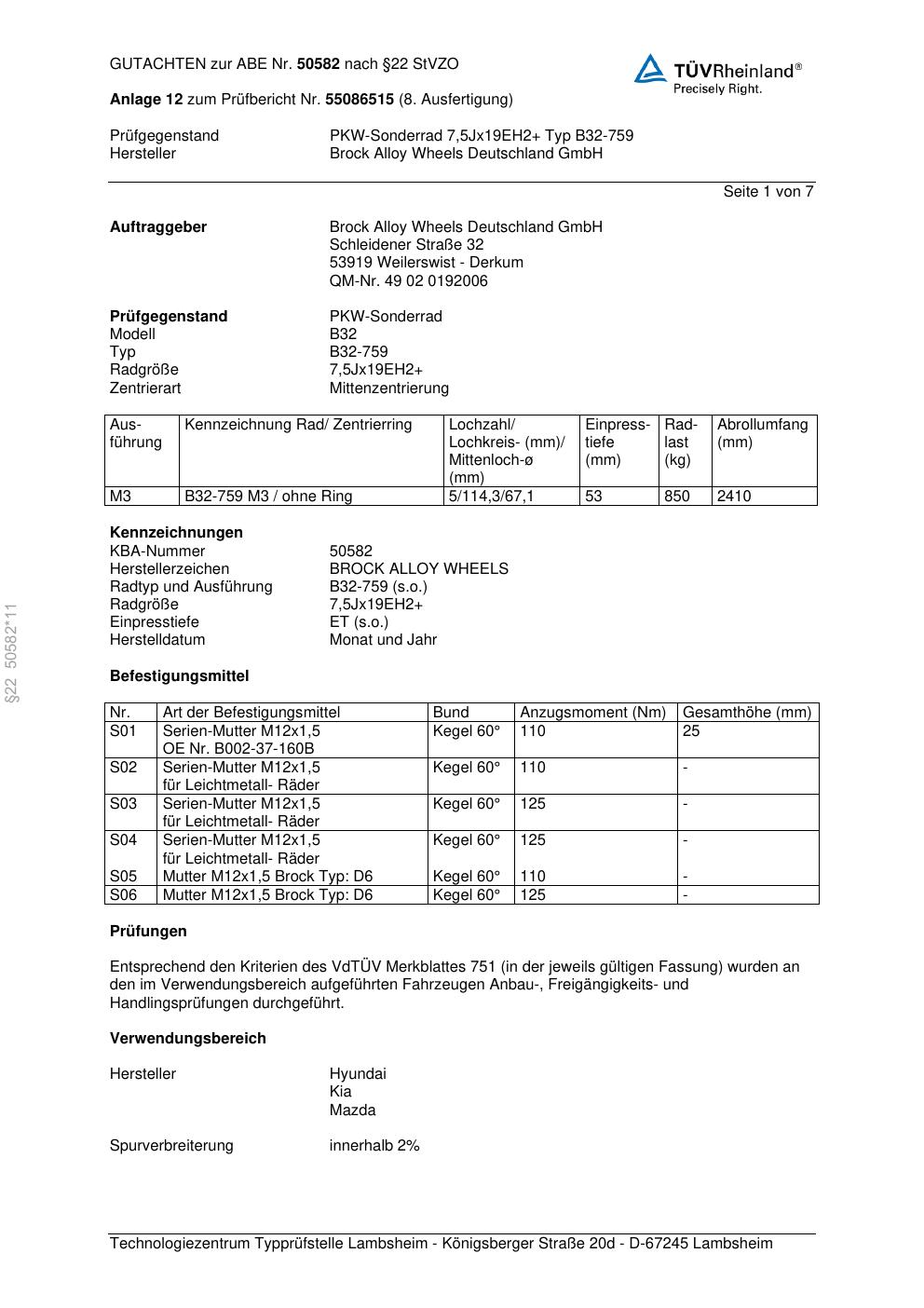 Dieses Gutachten (abe) bezieht sich auf die Alufelge Brock B32-75 9 in der Ausführung ET 0, Mittenloch 0 mm (KBA 50582). Im PDF findest du typischerweise zulässige Reifengrößen, Auflagen/Anbauhinweise und – je nach Dokument – Hinweise zur Eintragung.