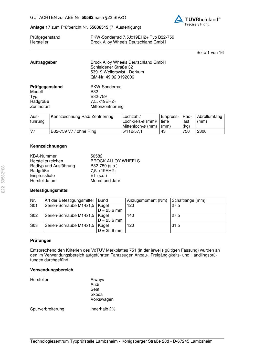 Dieses Gutachten (abe) bezieht sich auf die Alufelge Brock B32-75 9 in der Ausführung 8.5Jx19 ET 0, Mittenloch 0 mm (KBA 50582). Im PDF findest du typischerweise zulässige Reifengrößen, Auflagen/Anbauhinweise und – je nach Dokument – Hinweise zur Eintragung.