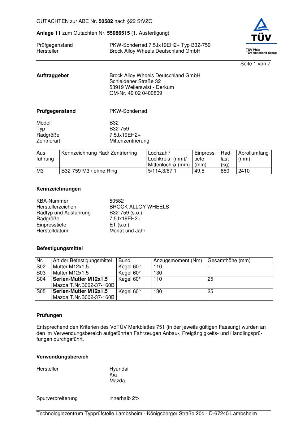 Dieses Gutachten (abe) bezieht sich auf die Alufelge Brock B32-75 9 in der Ausführung 7.5Jx19 ET 0, Mittenloch 0 mm (KBA 50582). Im PDF findest du typischerweise zulässige Reifengrößen, Auflagen/Anbauhinweise und – je nach Dokument – Hinweise zur Eintragung.