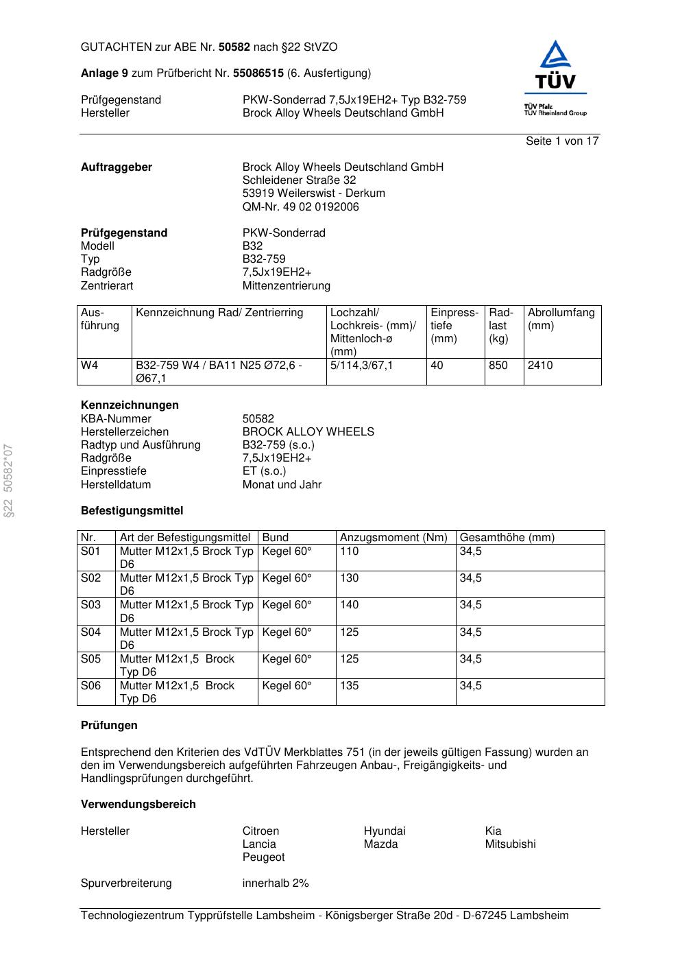 Dieses Gutachten (abe) bezieht sich auf die Alufelge Brock B32-75 9 in der Ausführung ET 0, Mittenloch 0 mm (KBA 50582). Im PDF findest du typischerweise zulässige Reifengrößen, Auflagen/Anbauhinweise und – je nach Dokument – Hinweise zur Eintragung.