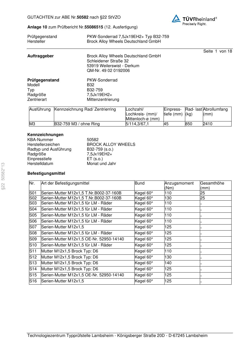 Dieses Gutachten (abe) bezieht sich auf die Alufelge Brock B32-75 9 in der Ausführung ET 0, Mittenloch 0 mm (KBA 50582). Im PDF findest du typischerweise zulässige Reifengrößen, Auflagen/Anbauhinweise und – je nach Dokument – Hinweise zur Eintragung.