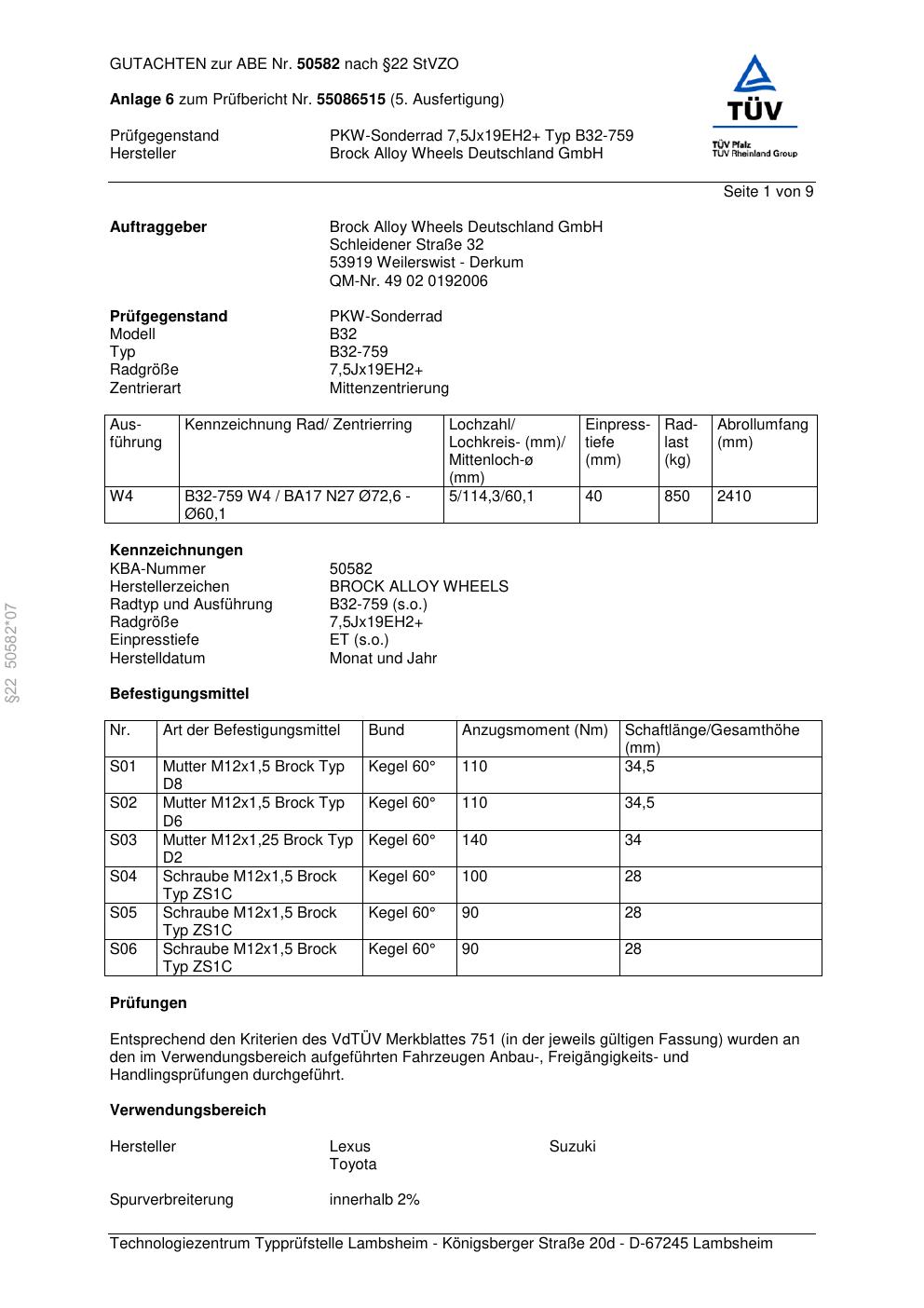 Dieses Gutachten (abe) bezieht sich auf die Alufelge Brock B32-75 9 in der Ausführung ET 0, Mittenloch 0 mm (KBA 50582). Im PDF findest du typischerweise zulässige Reifengrößen, Auflagen/Anbauhinweise und – je nach Dokument – Hinweise zur Eintragung.
