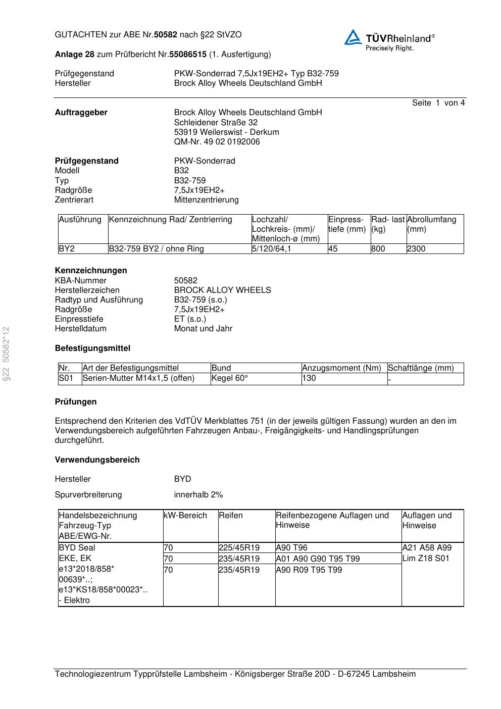 Dieses Gutachten (abe) bezieht sich auf die Alufelge Brock B32-75 9 in der Ausführung ET 0, Mittenloch 0 mm (KBA 50582). Im PDF findest du typischerweise zulässige Reifengrößen, Auflagen/Anbauhinweise und – je nach Dokument – Hinweise zur Eintragung.