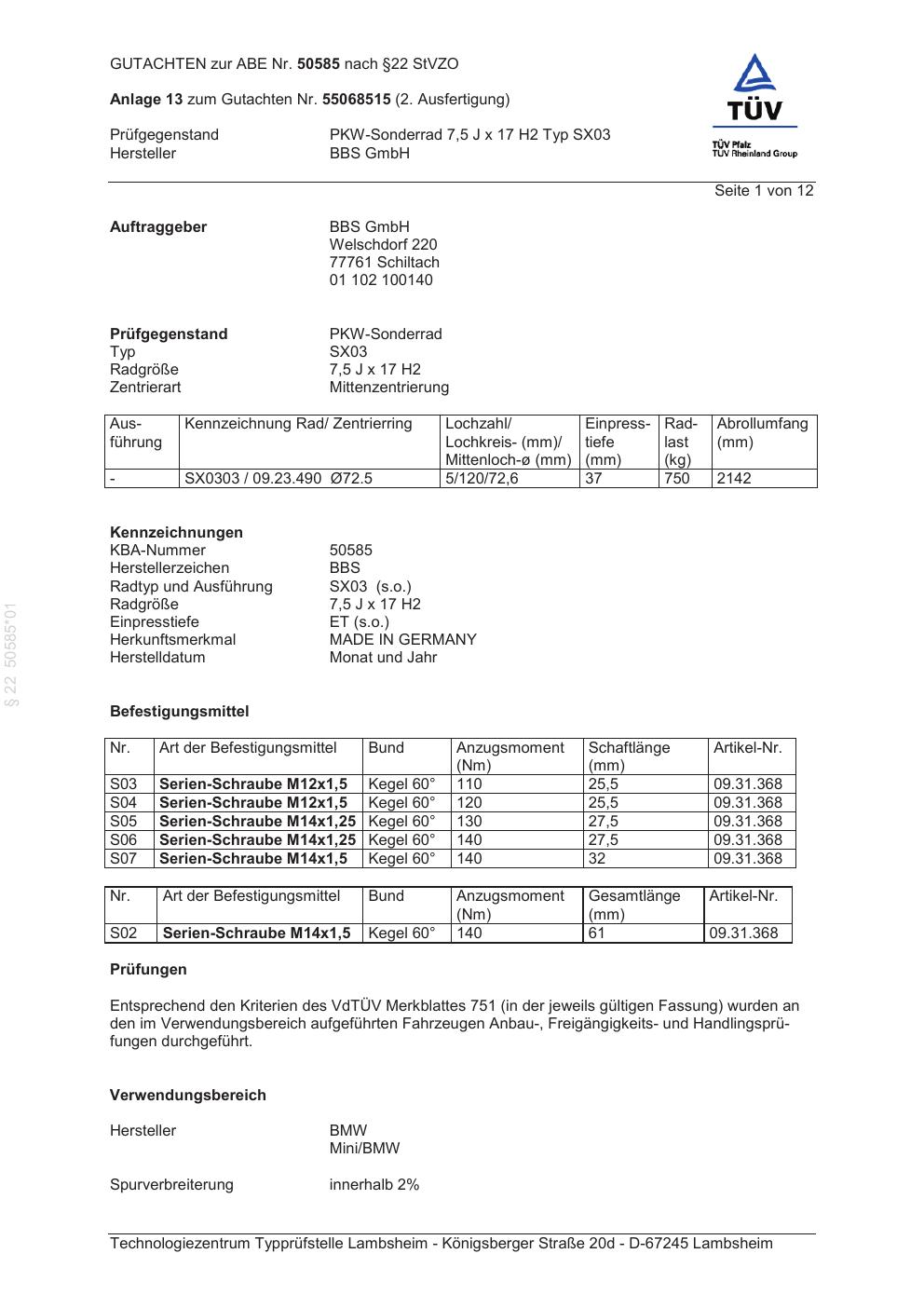 Dieses Gutachten (abe) bezieht sich auf die Alufelge BBS SX03 in der Ausführung 7.5Jx17 ET 0, Mittenloch 0 mm (KBA 50585). Im PDF findest du typischerweise zulässige Reifengrößen, Auflagen/Anbauhinweise und – je nach Dokument – Hinweise zur Eintragung.