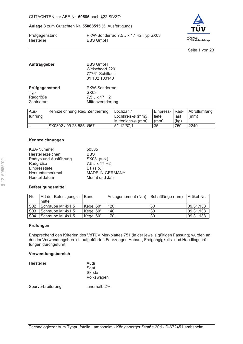 Dieses Gutachten (abe) bezieht sich auf die Alufelge BBS SX03 in der Ausführung 7.5Jx17 ET 0, Mittenloch 0 mm (KBA 50585). Im PDF findest du typischerweise zulässige Reifengrößen, Auflagen/Anbauhinweise und – je nach Dokument – Hinweise zur Eintragung.
