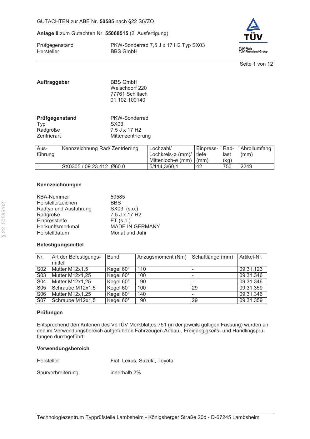 Dieses Gutachten (abe) bezieht sich auf die Alufelge BBS SX03 in der Ausführung 7.5Jx17 ET 0, Mittenloch 0 mm (KBA 50585). Im PDF findest du typischerweise zulässige Reifengrößen, Auflagen/Anbauhinweise und – je nach Dokument – Hinweise zur Eintragung.