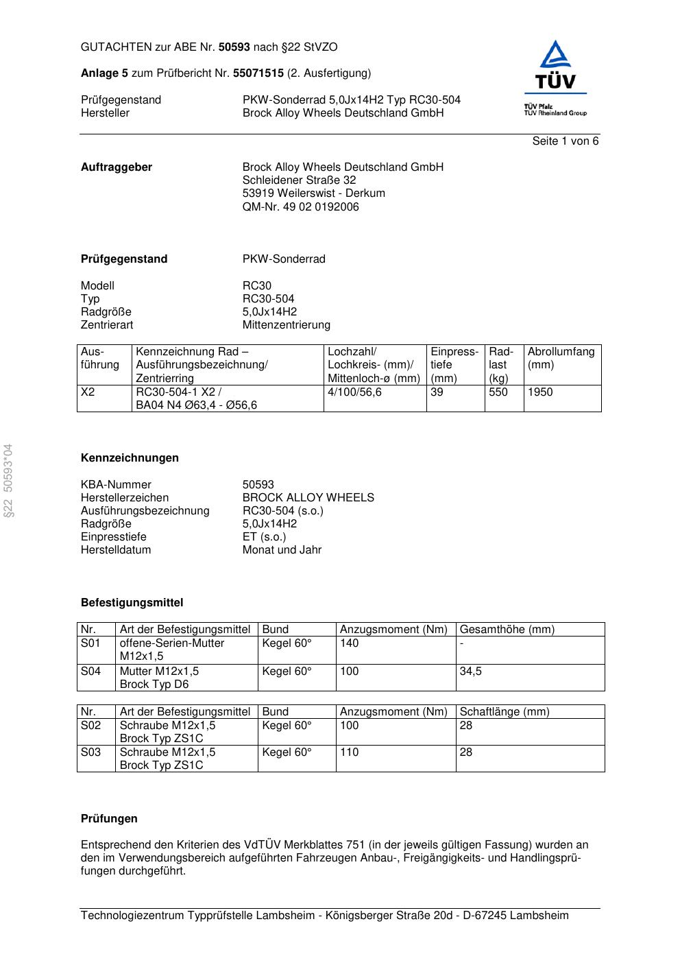 Dieses Gutachten (abe) bezieht sich auf die Alufelge Brock RC30-504 in der Ausführung 5Jx14 ET 0, Mittenloch 0 mm (KBA 50593). Im PDF findest du typischerweise zulässige Reifengrößen, Auflagen/Anbauhinweise und – je nach Dokument – Hinweise zur Eintragung.