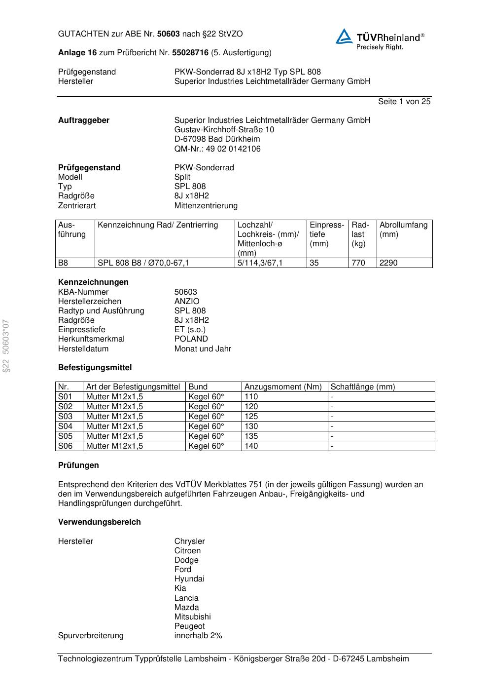 Dieses abe gehört zur Felge Anzio SPL 808 in 8Jx18 ET0 mit KBA 50603. Die Seite ist dafür gedacht, dass du schnell prüfen kannst, ob KBA, Design und Größe zu deiner Felge passen und danach direkt das richtige PDF lädst.