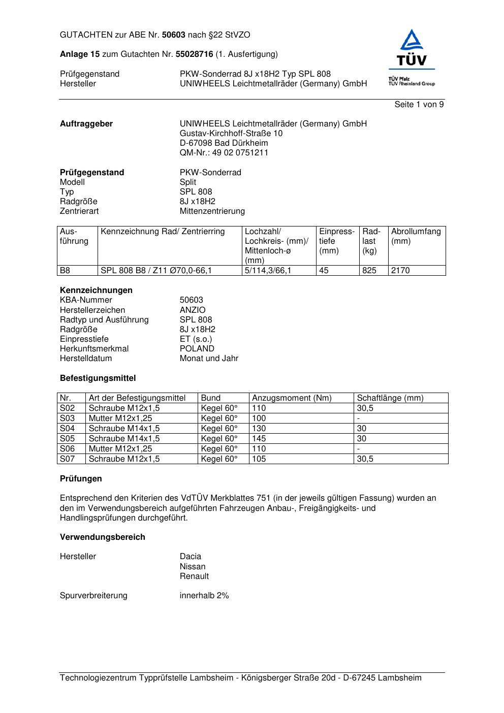 Dieses abe gehört zur Felge Anzio SPL 808 in 8Jx18 ET0 mit KBA 50603. Die Seite ist dafür gedacht, dass du schnell prüfen kannst, ob KBA, Design und Größe zu deiner Felge passen und danach direkt das richtige PDF lädst.
