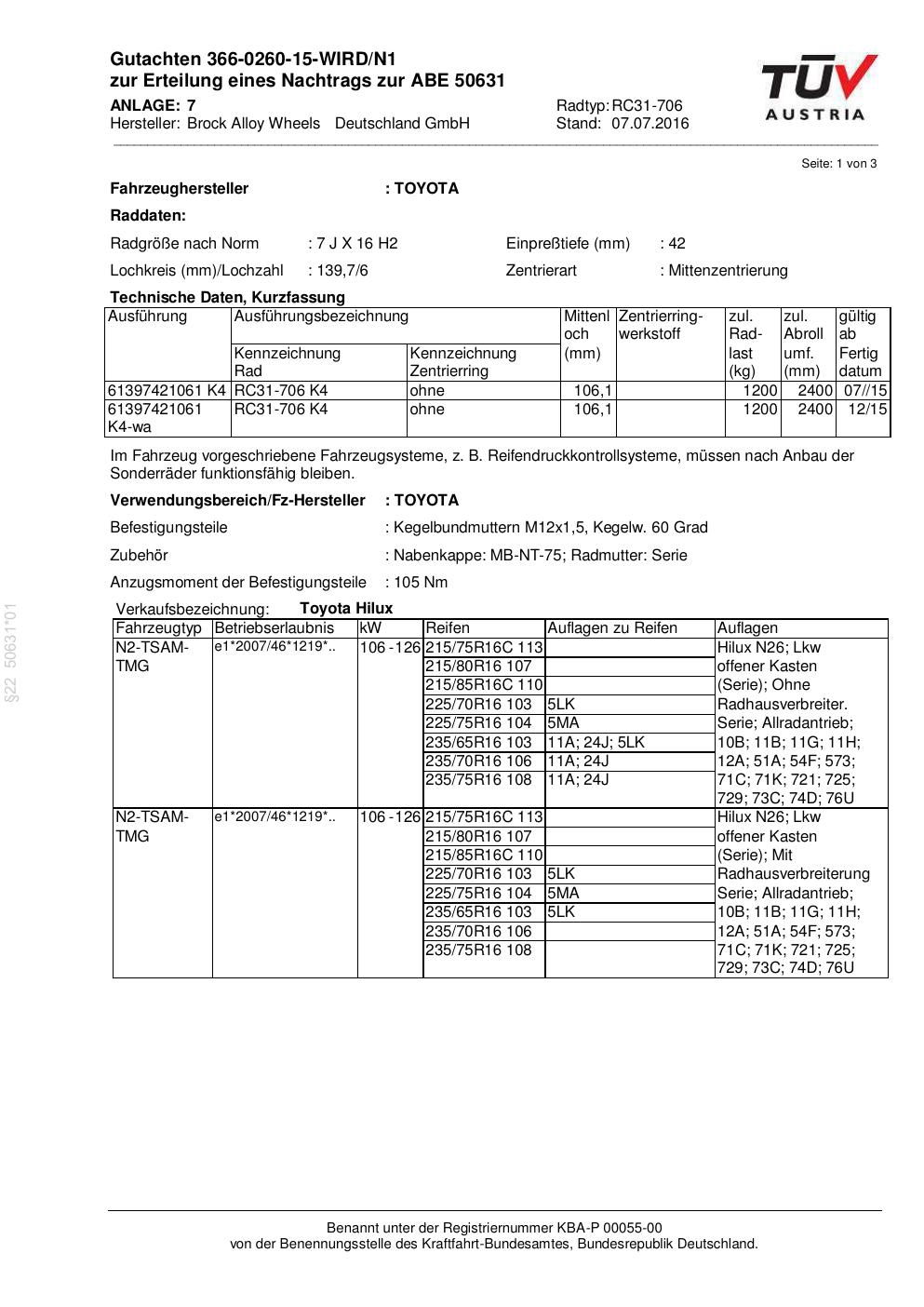 Dieses Gutachten (abe) bezieht sich auf die Alufelge Brock RC31-706 in der Ausführung 7Jx16 ET 0, Mittenloch 0 mm (KBA 50631). Im PDF findest du typischerweise zulässige Reifengrößen, Auflagen/Anbauhinweise und – je nach Dokument – Hinweise zur Eintragung.