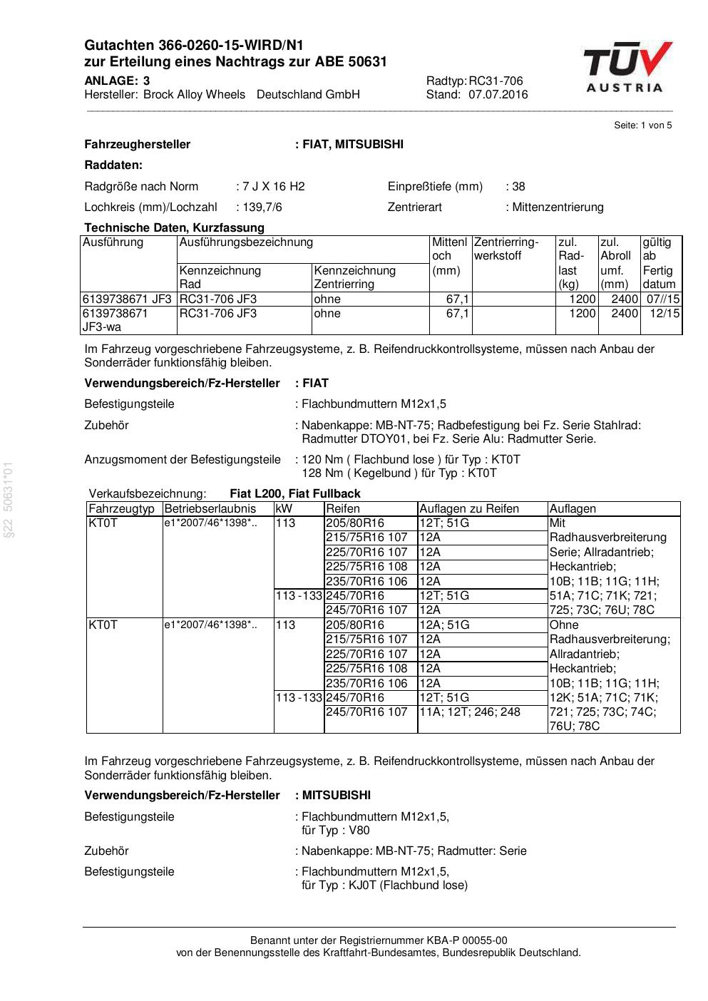 Dieses Gutachten (abe) bezieht sich auf die Alufelge Brock RC31-706 in der Ausführung 7Jx16 ET 0, Mittenloch 0 mm (KBA 50631). Im PDF findest du typischerweise zulässige Reifengrößen, Auflagen/Anbauhinweise und – je nach Dokument – Hinweise zur Eintragung.