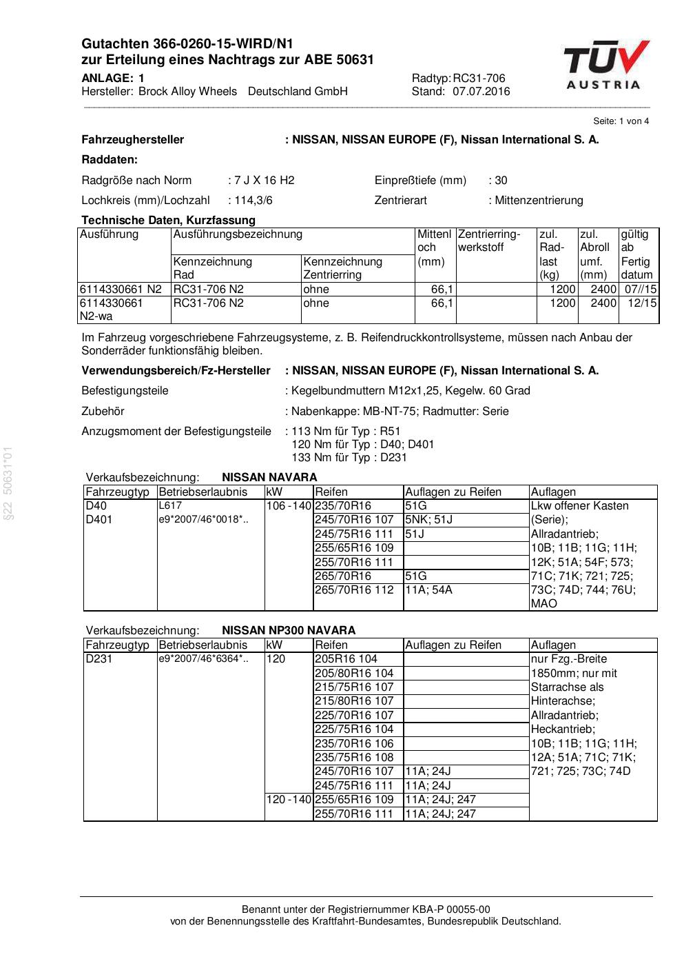 Dieses Gutachten (abe) bezieht sich auf die Alufelge Brock RC31-706 in der Ausführung 7Jx16 ET 0, Mittenloch 0 mm (KBA 50631). Im PDF findest du typischerweise zulässige Reifengrößen, Auflagen/Anbauhinweise und – je nach Dokument – Hinweise zur Eintragung.