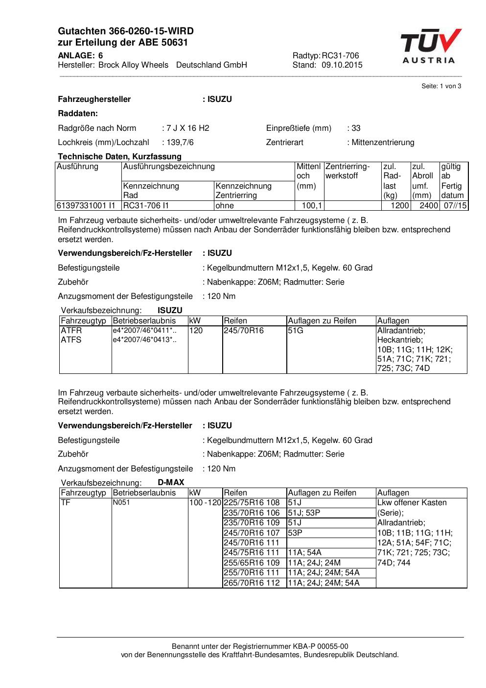 Dieses Gutachten (abe) bezieht sich auf die Alufelge Brock RC31 -706 in der Ausführung 7Jx16 ET 0, Mittenloch 0 mm (KBA 50631). Im PDF findest du typischerweise zulässige Reifengrößen, Auflagen/Anbauhinweise und – je nach Dokument – Hinweise zur Eintragung.