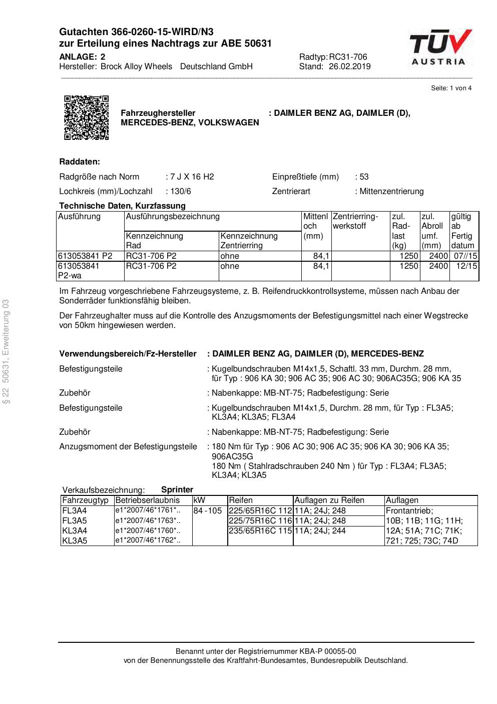 Dieses Gutachten (abe) bezieht sich auf die Alufelge Brock RC31-706 in der Ausführung 7Jx16 ET 0, Mittenloch 0 mm (KBA 50631). Im PDF findest du typischerweise zulässige Reifengrößen, Auflagen/Anbauhinweise und – je nach Dokument – Hinweise zur Eintragung.