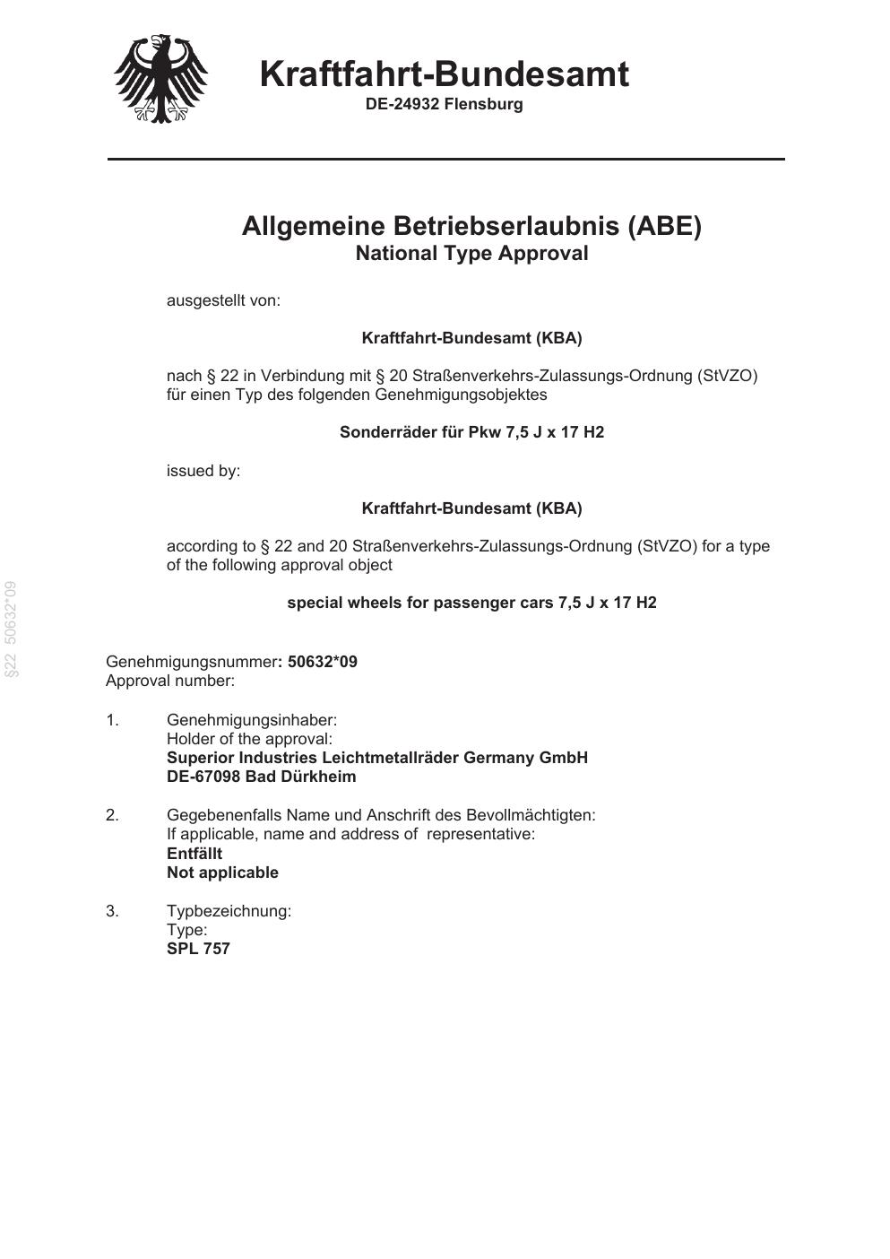 Dieses Gutachten (abe) bezieht sich auf die Alufelge brand-anzio SPL 606 in der Ausführung 7.5Jx17 ET 0, Mittenloch 0 mm (KBA 50632). Im PDF findest du typischerweise zulässige Reifengrößen, Auflagen/Anbauhinweise und – je nach Dokument – Hinweise zur Eintragung.
