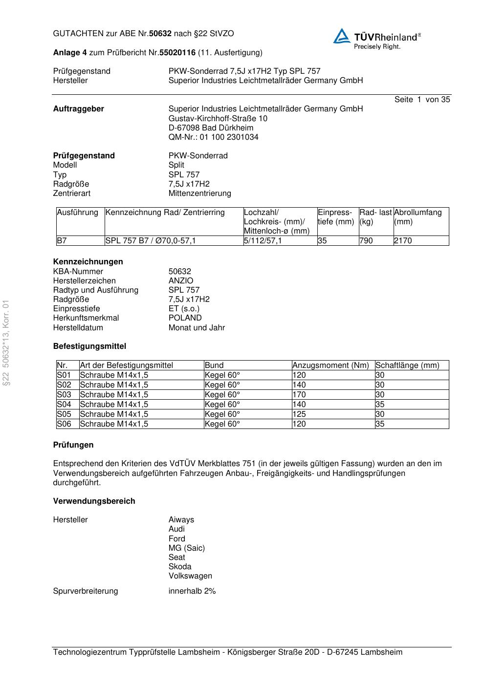 Dieses Gutachten (abe) bezieht sich auf die Alufelge Anzio SPL 757 in der Ausführung 7.5Jx17 ET 0, Mittenloch 0 mm (KBA 50632). Im PDF findest du typischerweise zulässige Reifengrößen, Auflagen/Anbauhinweise und – je nach Dokument – Hinweise zur Eintragung.