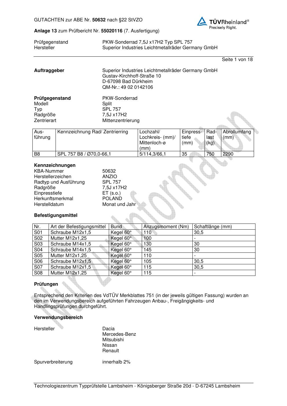 Dieses Gutachten (abe) bezieht sich auf die Alufelge Anzio SPL 757 in der Ausführung 7.5Jx17 ET 0, Mittenloch 0 mm (KBA 50632). Im PDF findest du typischerweise zulässige Reifengrößen, Auflagen/Anbauhinweise und – je nach Dokument – Hinweise zur Eintragung.