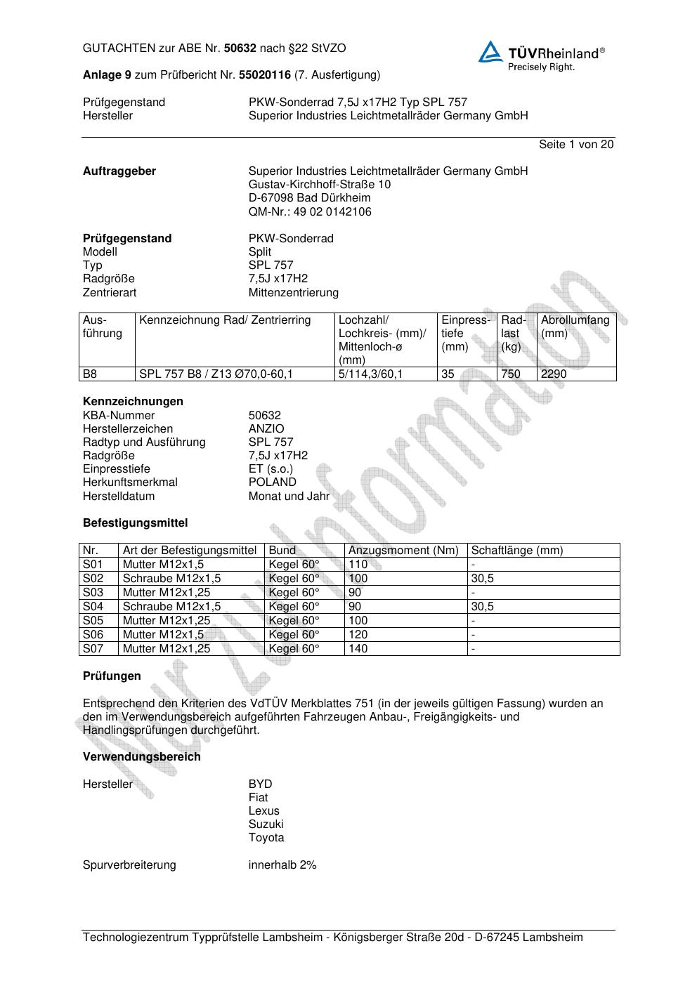Dieses Gutachten (abe) bezieht sich auf die Alufelge Anzio SPL 757 in der Ausführung 7.5Jx17 ET 0, Mittenloch 0 mm (KBA 50632). Im PDF findest du typischerweise zulässige Reifengrößen, Auflagen/Anbauhinweise und – je nach Dokument – Hinweise zur Eintragung.
