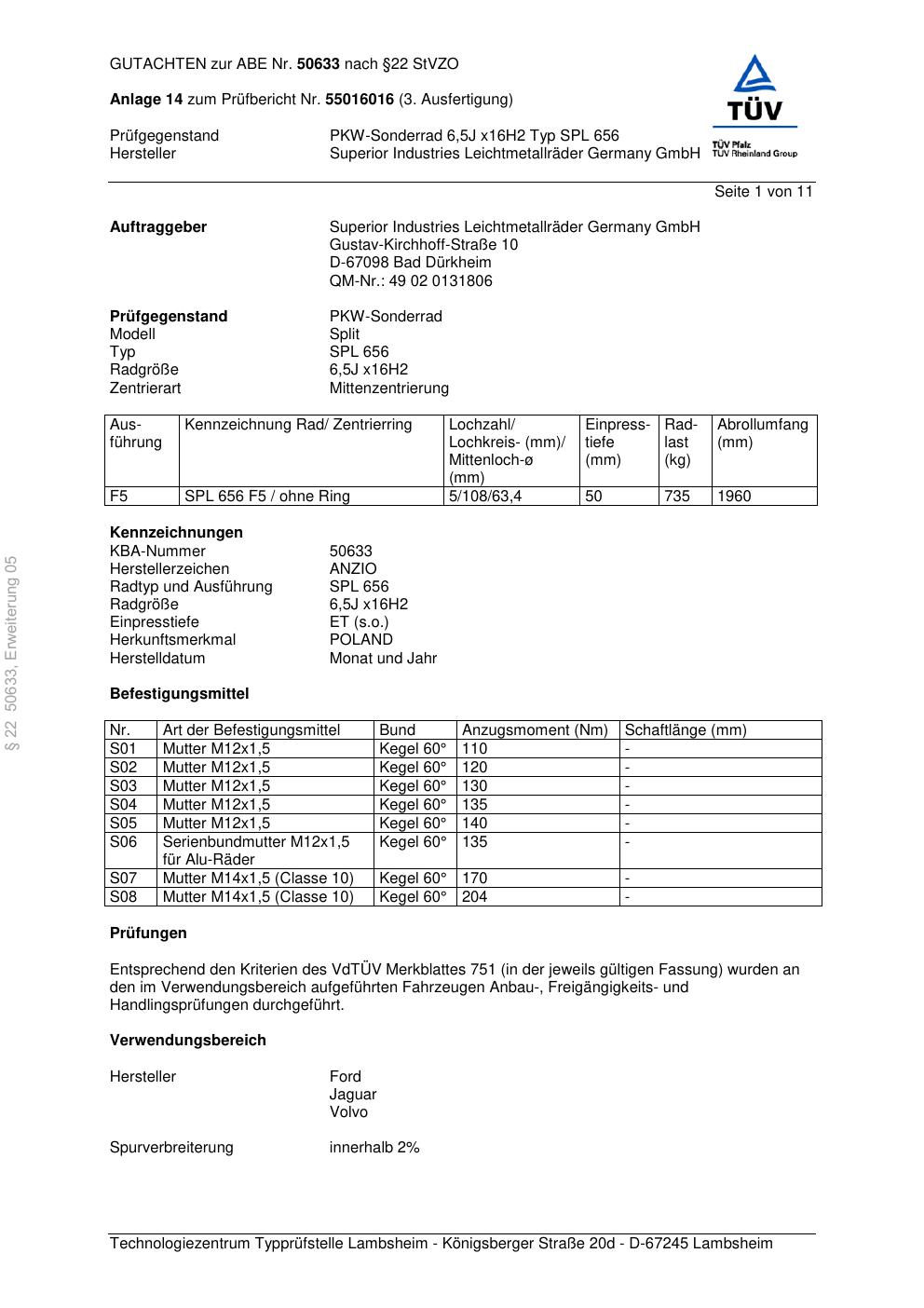 • Stimmt die KBA-Nummer auf der Felge mit diesem Dokument überein?