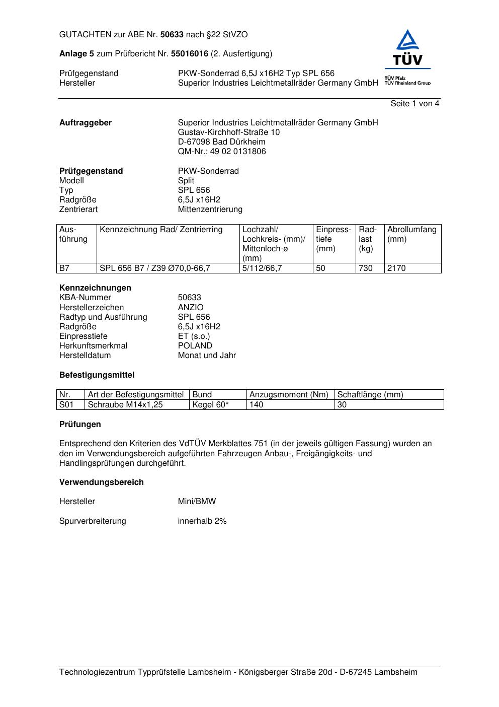 Dieses abe gehört zur Felge Anzio SPL 656 in 6.5Jx16 ET0 mit KBA 50633. Die Seite ist dafür gedacht, dass du schnell prüfen kannst, ob KBA, Design und Größe zu deiner Felge passen und danach direkt das richtige PDF lädst.
