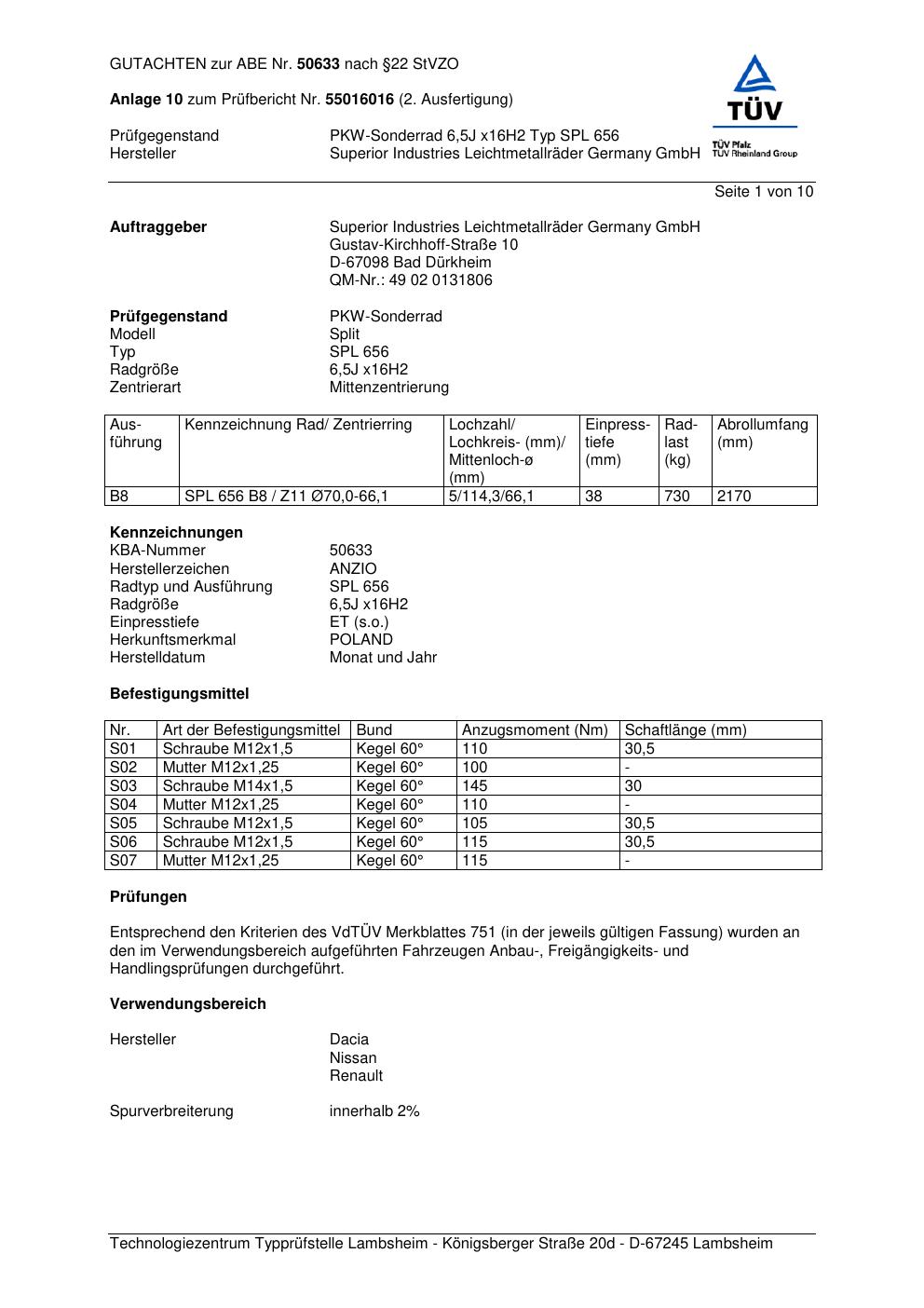 Dieses abe gehört zur Felge Anzio SPL 656 in 6.5Jx16 ET0 mit KBA 50633. Die Seite ist dafür gedacht, dass du schnell prüfen kannst, ob KBA, Design und Größe zu deiner Felge passen und danach direkt das richtige PDF lädst.
