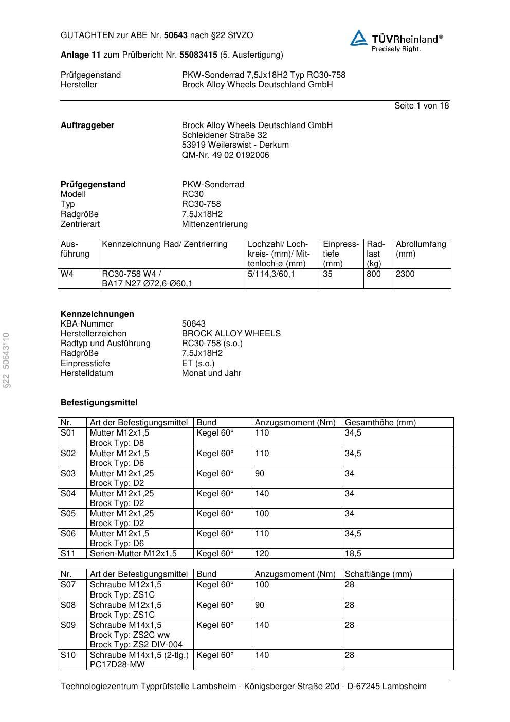 Dieses Gutachten (abe) bezieht sich auf die Alufelge Brock RC30-758 in der Ausführung 7.5Jx18 ET 0, Mittenloch 0 mm (KBA 50643). Im PDF findest du typischerweise zulässige Reifengrößen, Auflagen/Anbauhinweise und – je nach Dokument – Hinweise zur Eintragung.