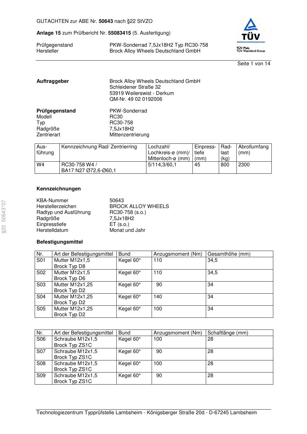 Dieses Gutachten (abe) bezieht sich auf die Alufelge Brock RC30-758 in der Ausführung 7.5Jx18 ET 0, Mittenloch 0 mm (KBA 50643). Im PDF findest du typischerweise zulässige Reifengrößen, Auflagen/Anbauhinweise und – je nach Dokument – Hinweise zur Eintragung.