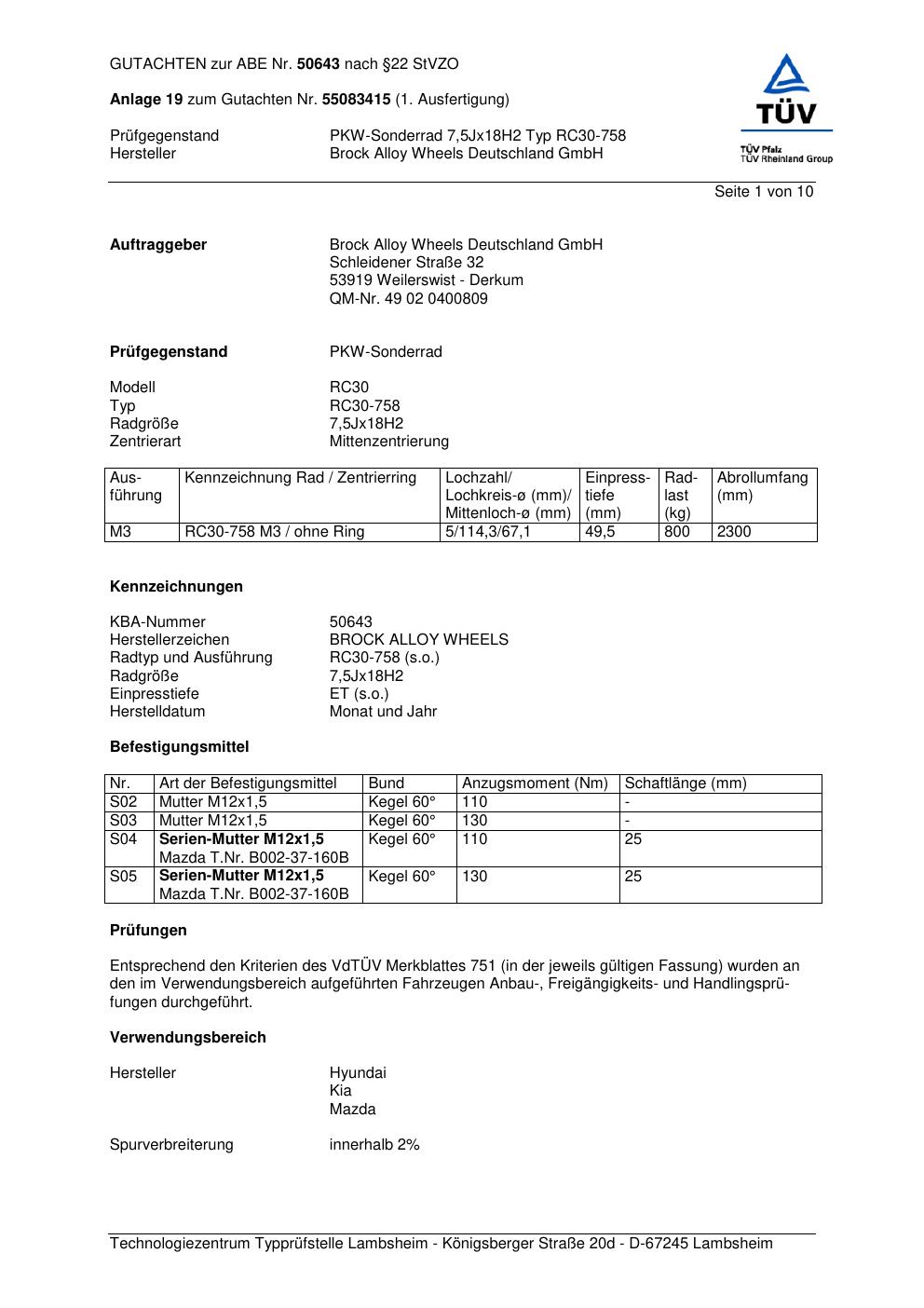 Dieses Gutachten (abe) bezieht sich auf die Alufelge Brock RC30-758 in der Ausführung 7.5Jx18 ET 0, Mittenloch 0 mm (KBA 50643). Im PDF findest du typischerweise zulässige Reifengrößen, Auflagen/Anbauhinweise und – je nach Dokument – Hinweise zur Eintragung.