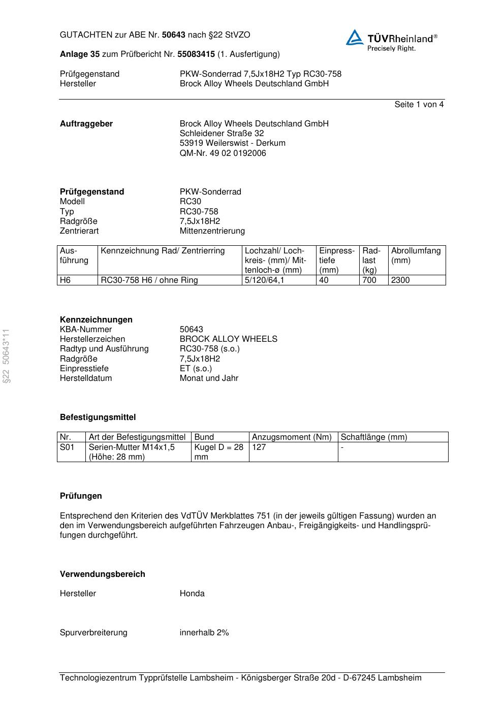Dieses Gutachten (abe) bezieht sich auf die Alufelge Brock RC30-758 in der Ausführung 7.5Jx18 ET 0, Mittenloch 0 mm (KBA 50643). Im PDF findest du typischerweise zulässige Reifengrößen, Auflagen/Anbauhinweise und – je nach Dokument – Hinweise zur Eintragung.