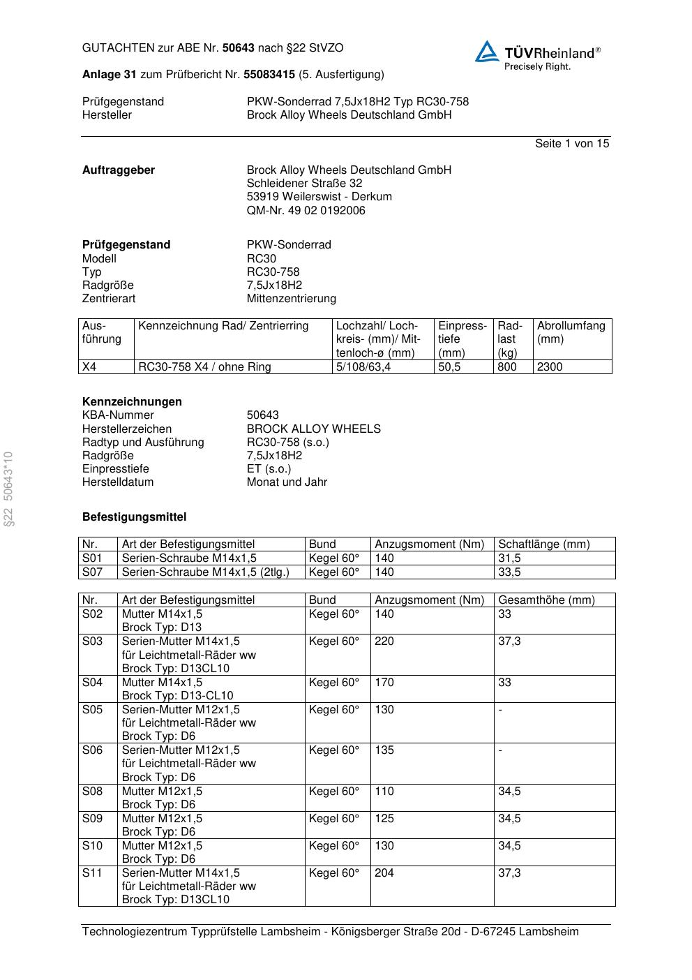 Dieses Gutachten (abe) bezieht sich auf die Alufelge Brock RC30-758 in der Ausführung 7.5Jx18 ET 0, Mittenloch 0 mm (KBA 50643). Im PDF findest du typischerweise zulässige Reifengrößen, Auflagen/Anbauhinweise und – je nach Dokument – Hinweise zur Eintragung.