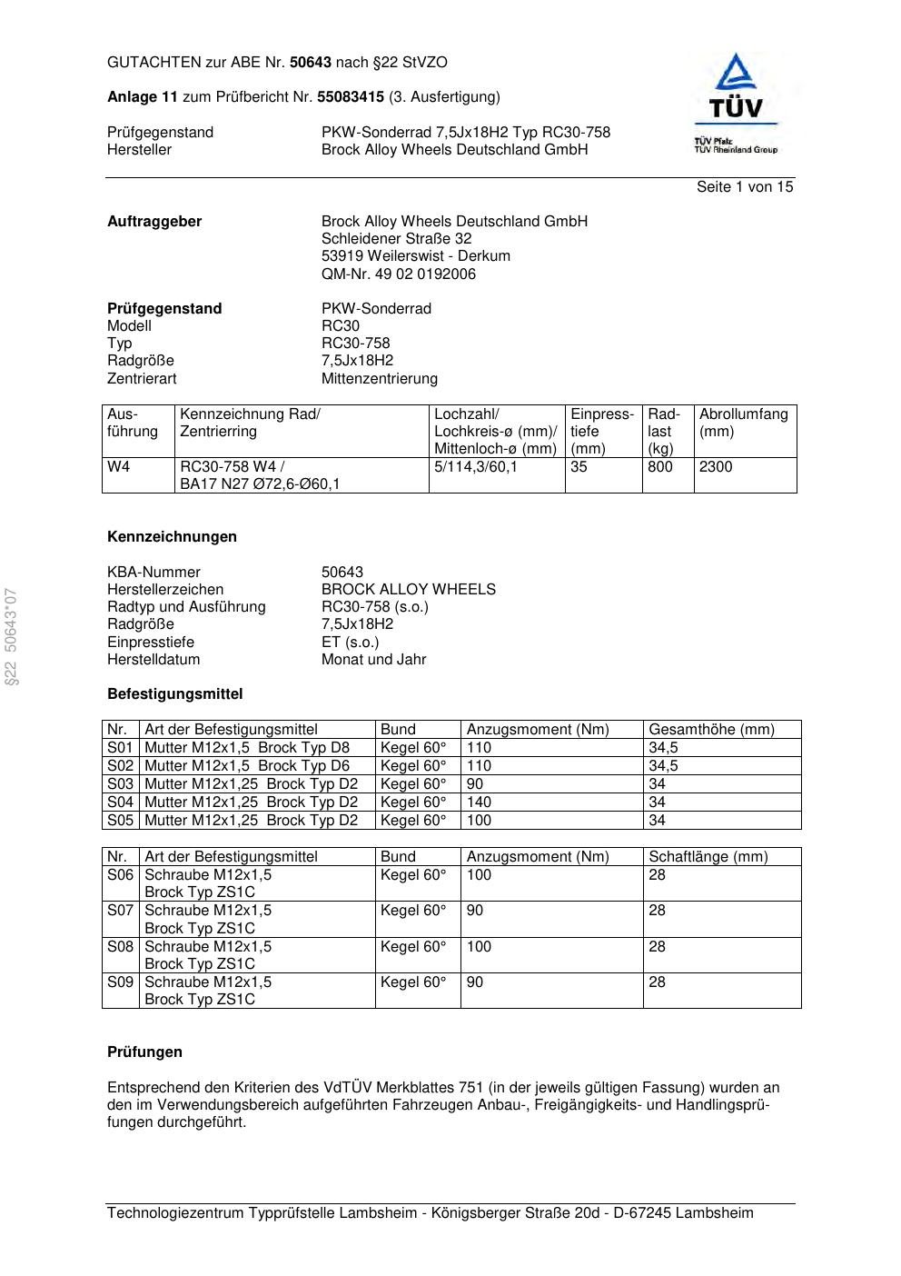 Dieses Gutachten (abe) bezieht sich auf die Alufelge Brock RC30-758 in der Ausführung 7.5Jx18 ET 0, Mittenloch 0 mm (KBA 50643). Im PDF findest du typischerweise zulässige Reifengrößen, Auflagen/Anbauhinweise und – je nach Dokument – Hinweise zur Eintragung.