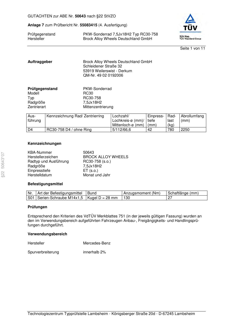 Dieses Gutachten (abe) bezieht sich auf die Alufelge Brock RC30-758 in der Ausführung 7.5Jx18 ET 0, Mittenloch 0 mm (KBA 50643). Im PDF findest du typischerweise zulässige Reifengrößen, Auflagen/Anbauhinweise und – je nach Dokument – Hinweise zur Eintragung.